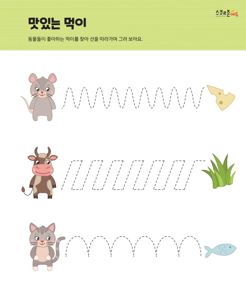 직선, 곡선, 미로 등 다양한 선 따라가기로 반복해도 지루하지 않아요.