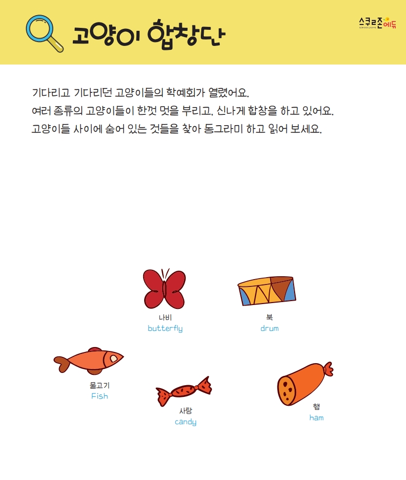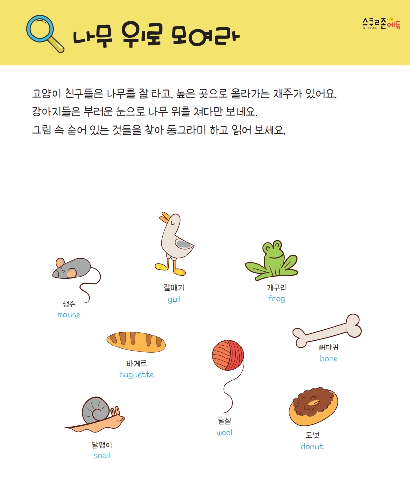 프린트 후, 그림 속에 숨은 사물을 하나씩 동그라미 또는 색칠하며 찾아보세요.