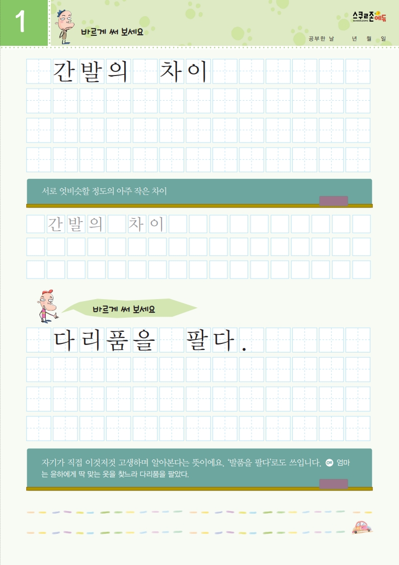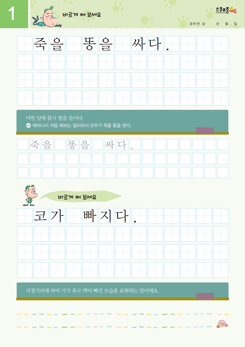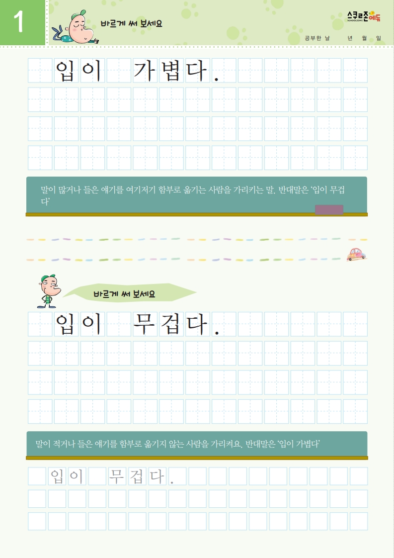 재미있는 관용어를 따라 쓰며 글씨체와 어휘력을 함께 기를 수 있습니다.