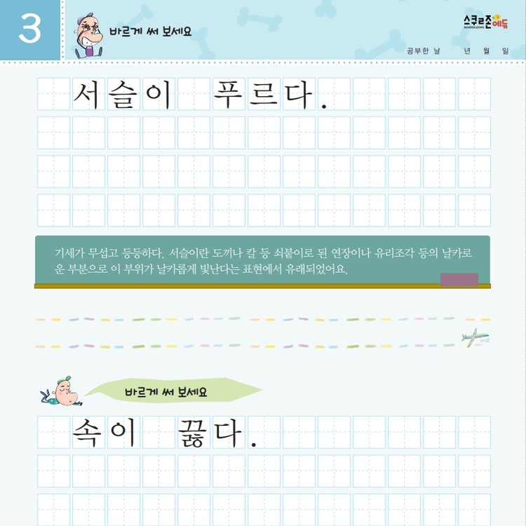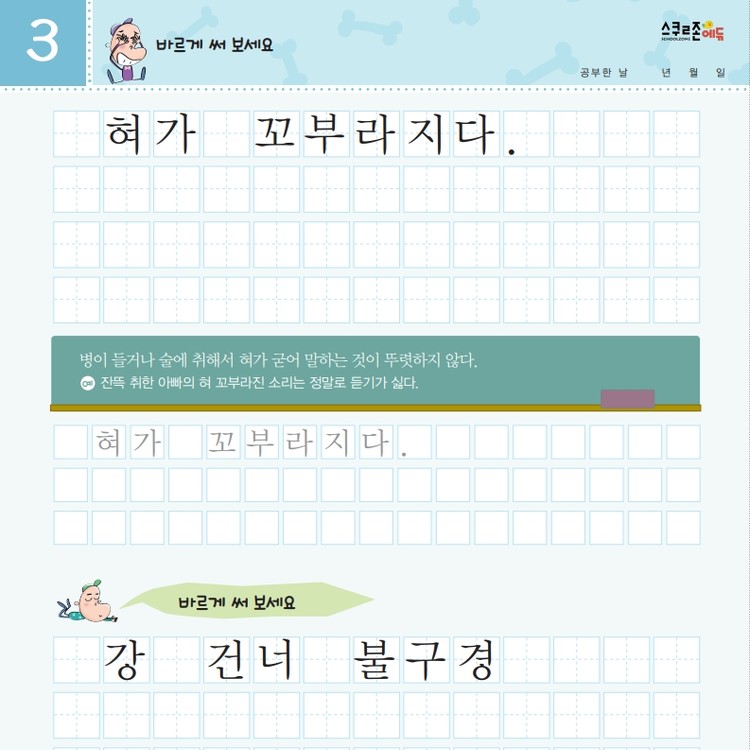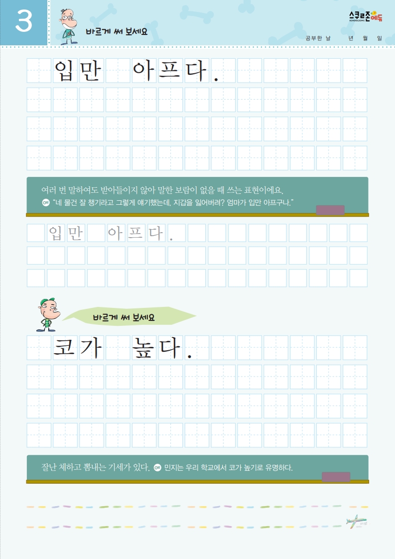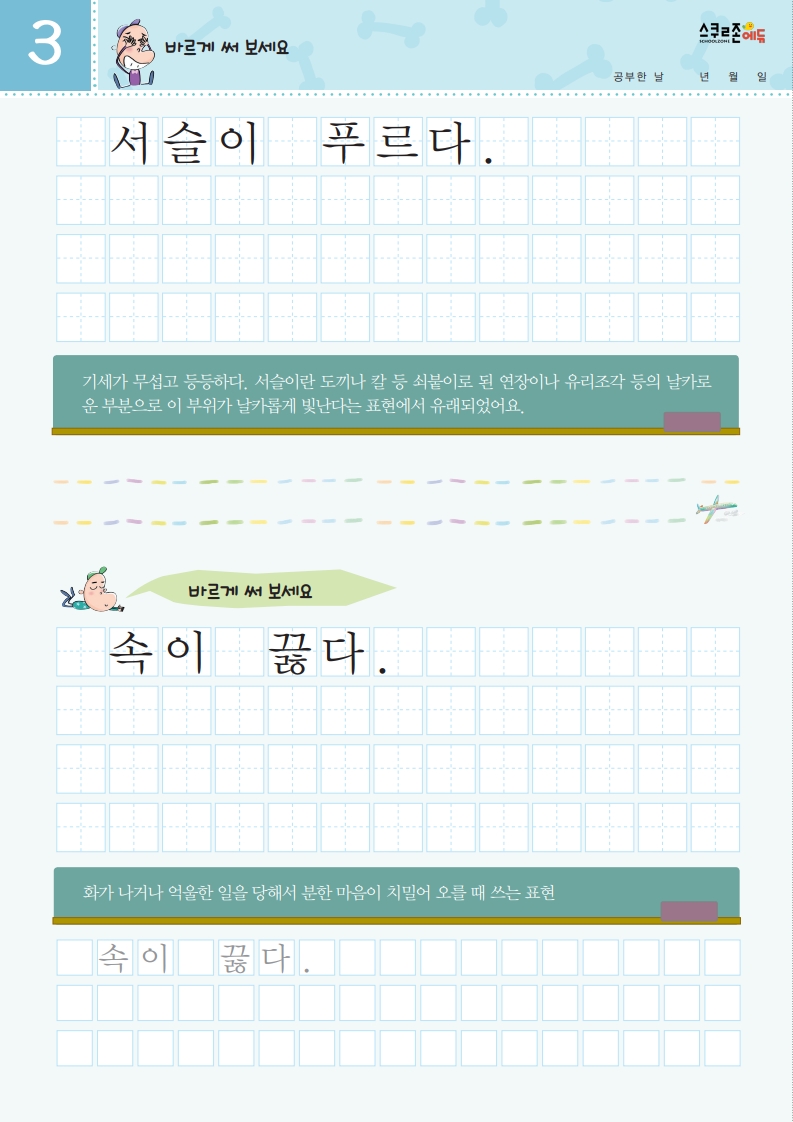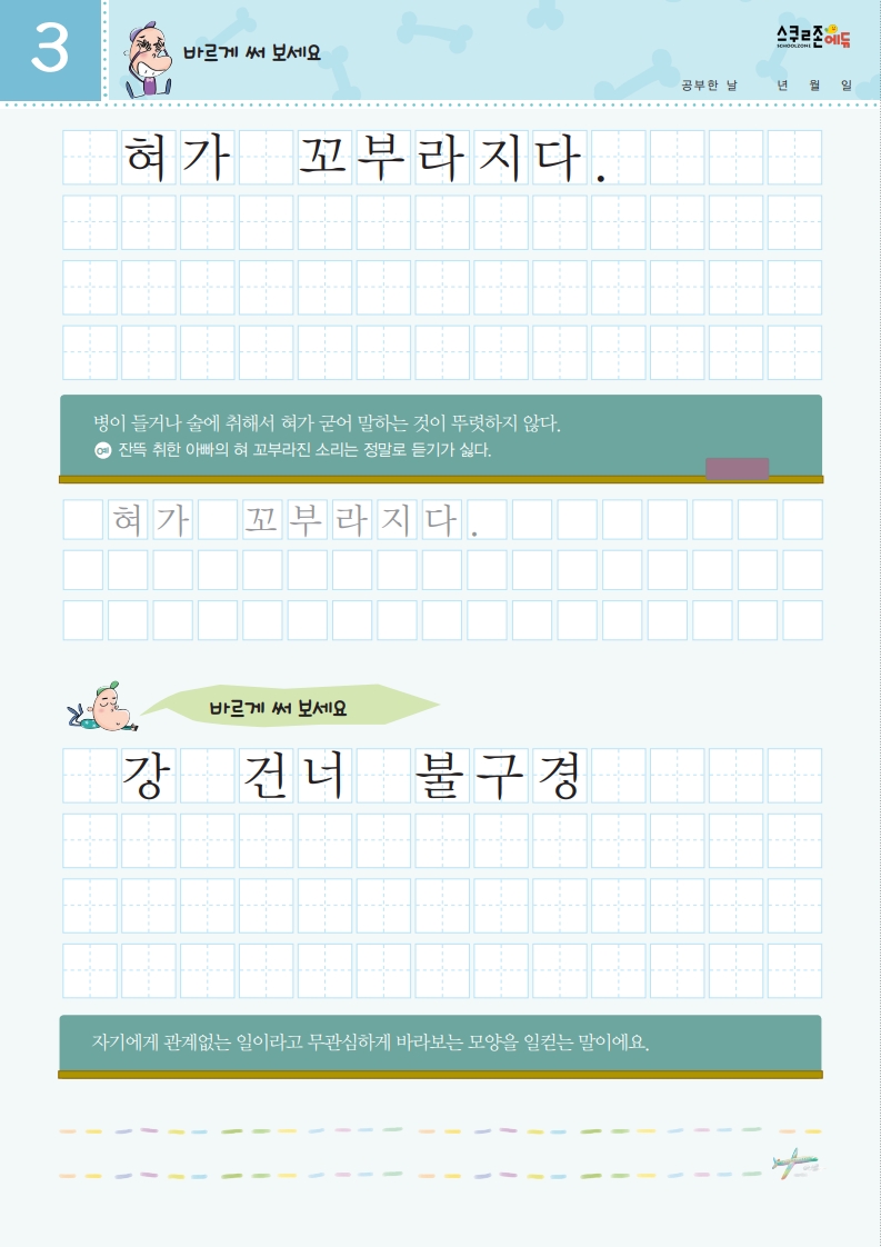 재미있는 관용어를 따라 쓰며 글씨체와 어휘력을 함께 기를 수 있습니다.
