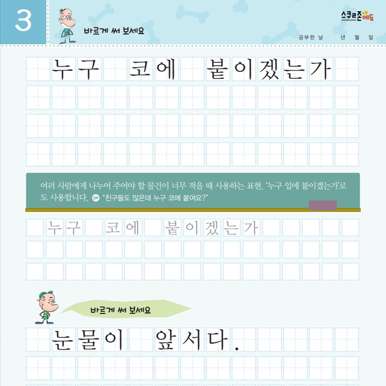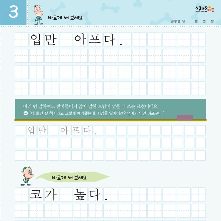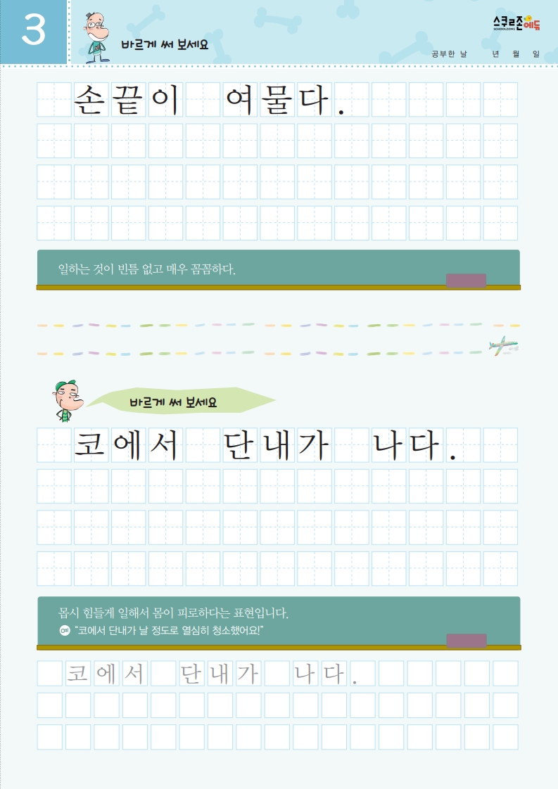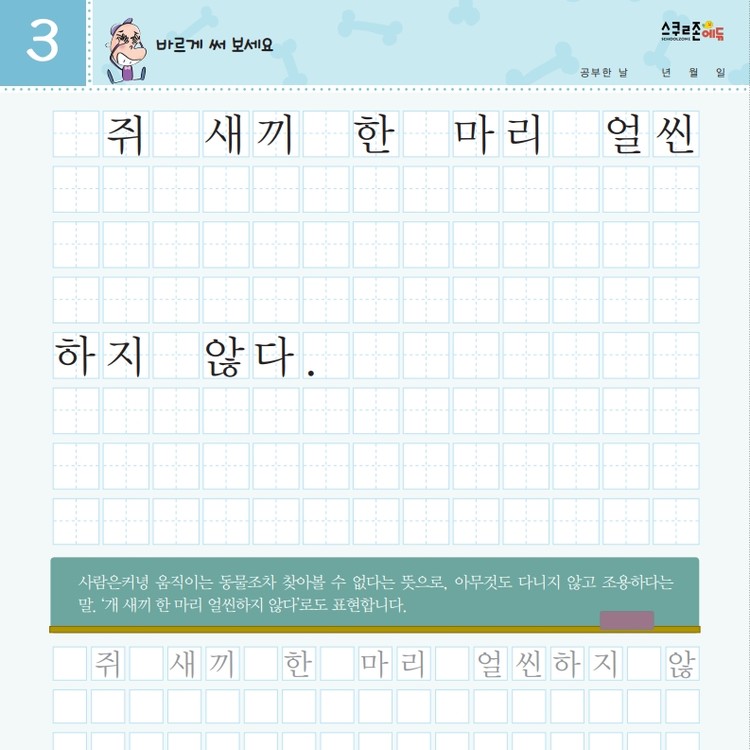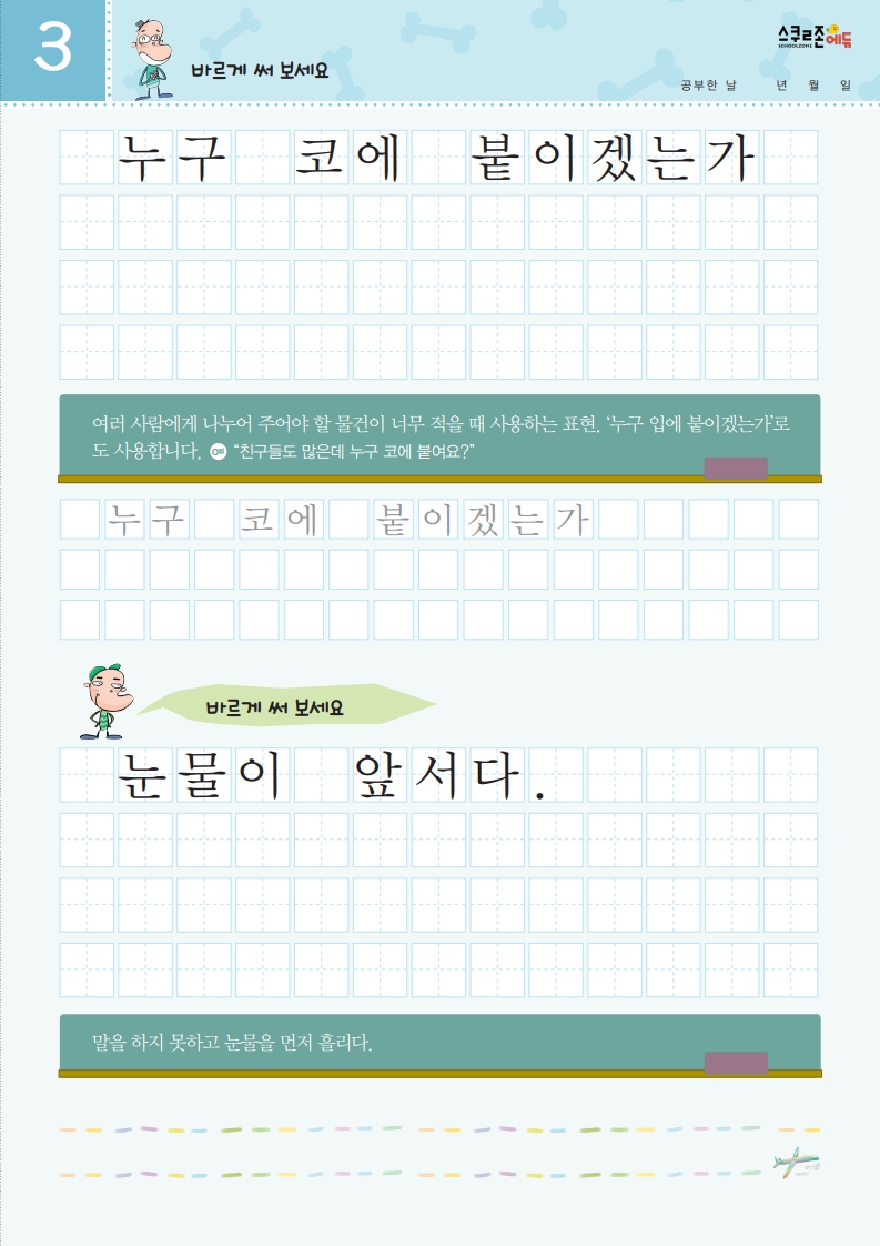 재미있는 관용어를 따라 쓰며 글씨체와 어휘력을 함께 기를 수 있습니다.