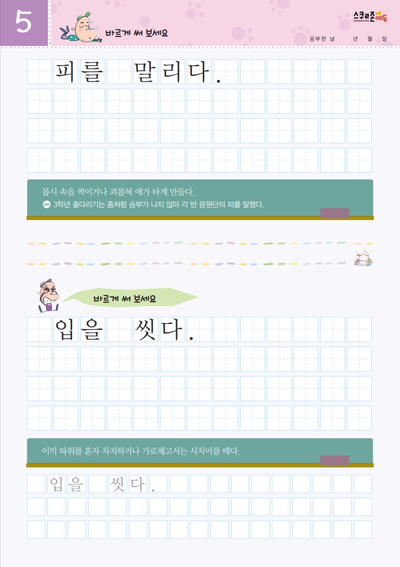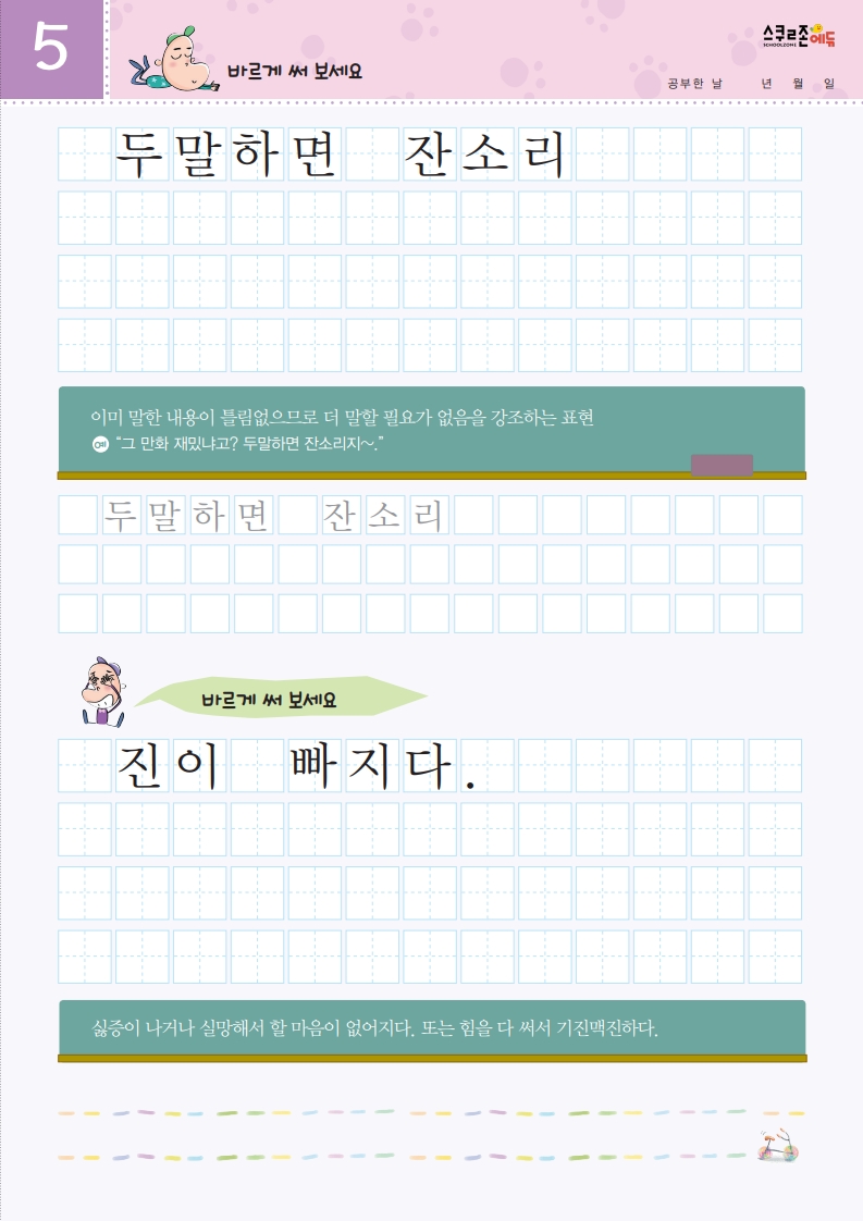 재미있는 관용어를 따라 쓰며 글씨체와 어휘력을 함께 기를 수 있습니다.