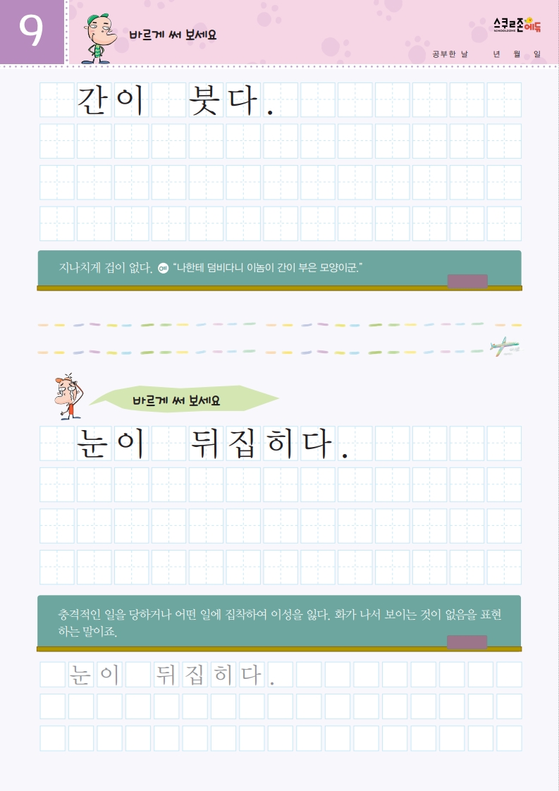 재미있는 관용어를 따라 쓰며 글씨체와 어휘력을 함께 기를 수 있습니다.