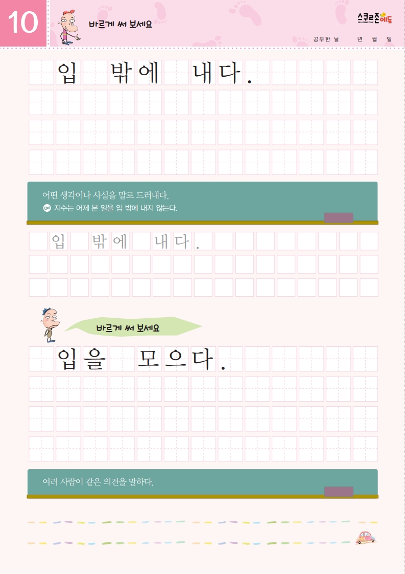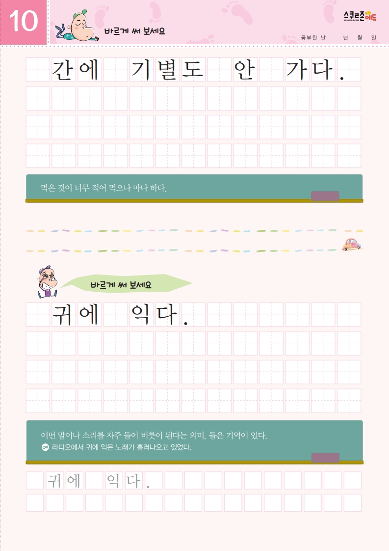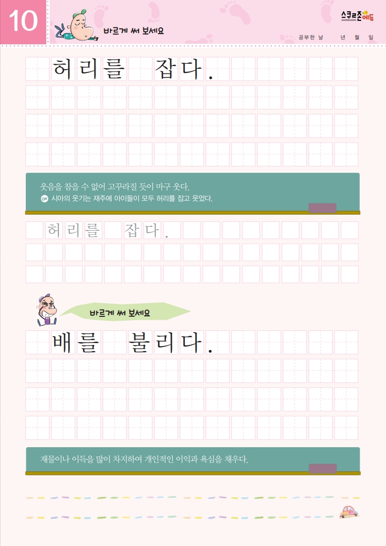 재미있는 관용어를 따라 쓰며 글씨체와 어휘력을 함께 기를 수 있습니다.