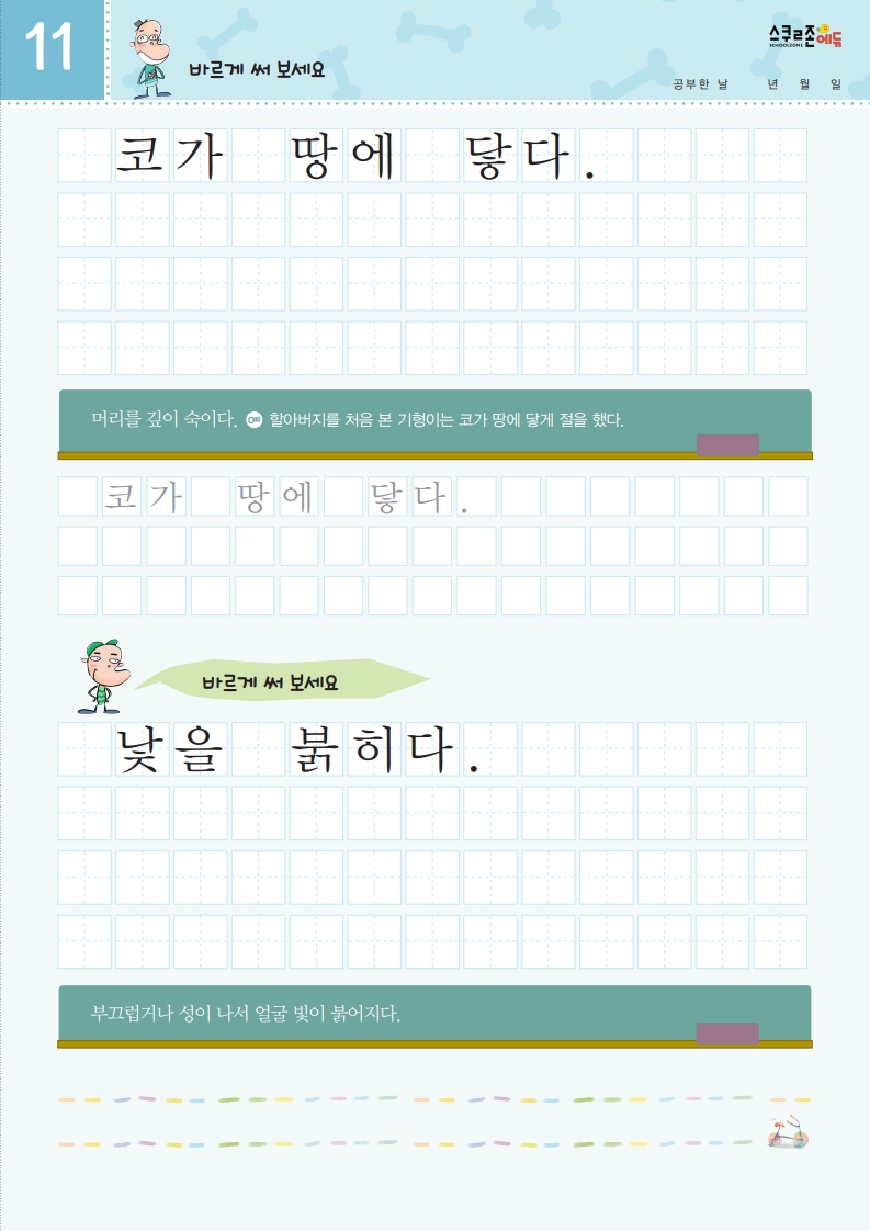 재미있는 관용어를 따라 쓰며 글씨체와 어휘력을 함께 기를 수 있습니다.