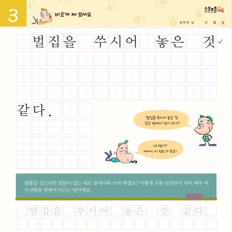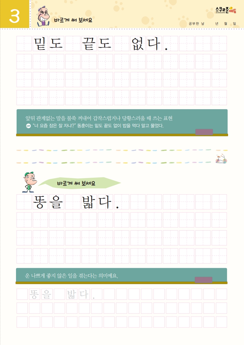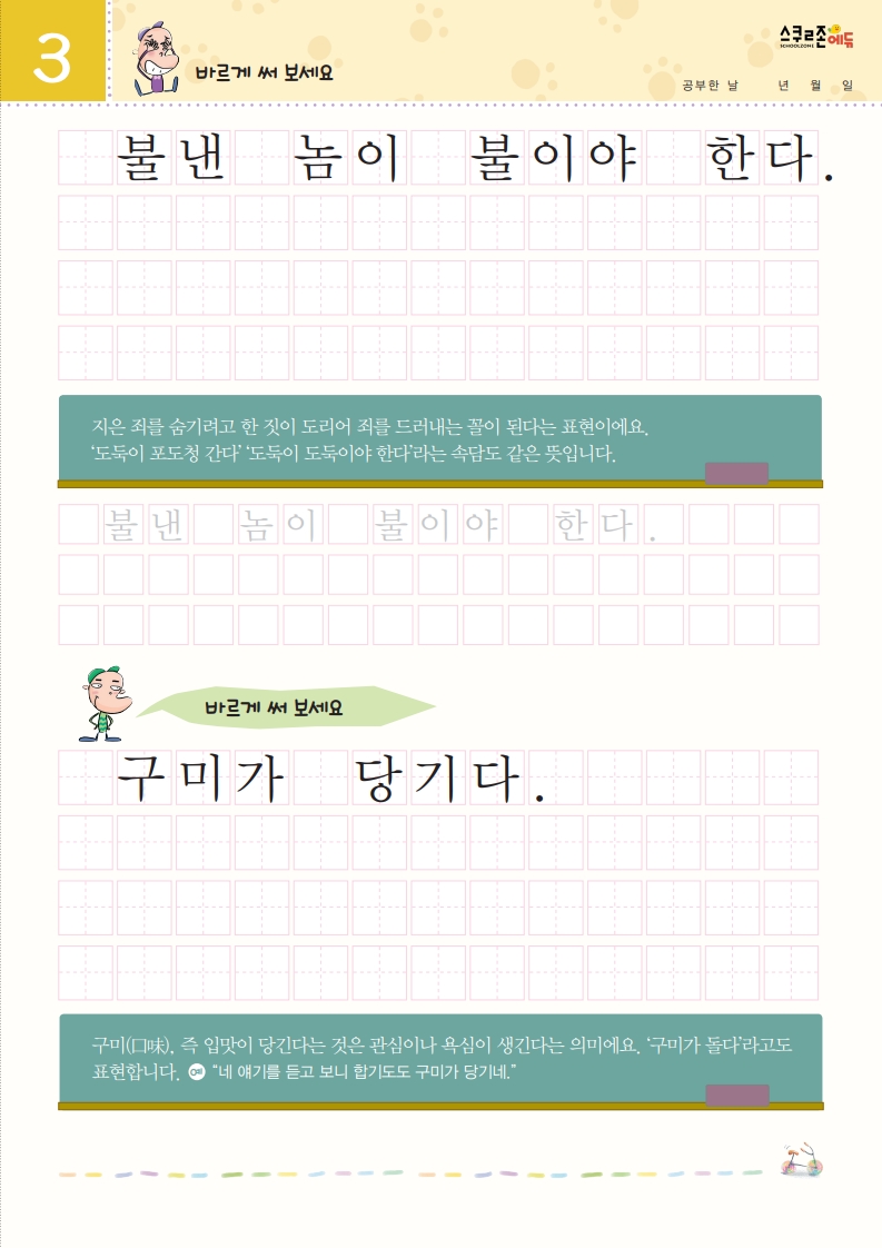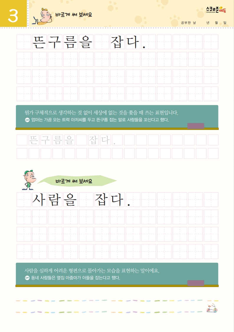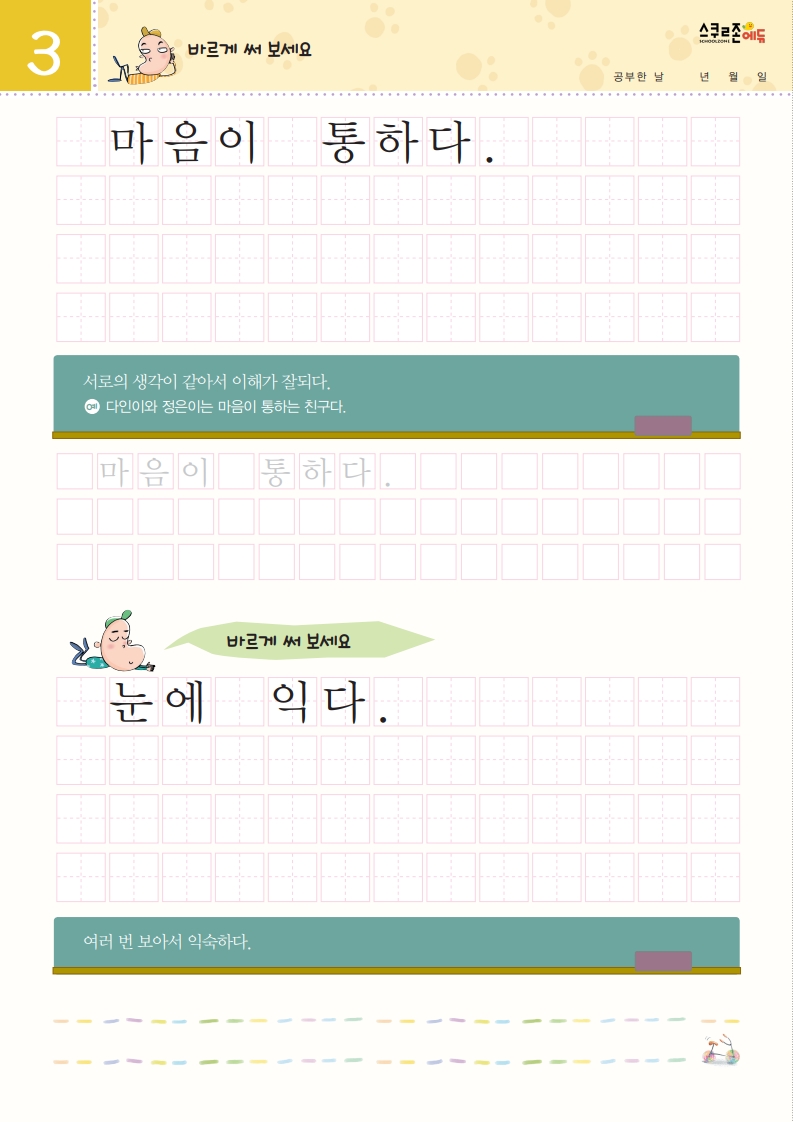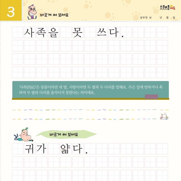 재미있는 관용어를 따라 쓰며 글씨체와 어휘력을 함께 기를 수 있습니다.