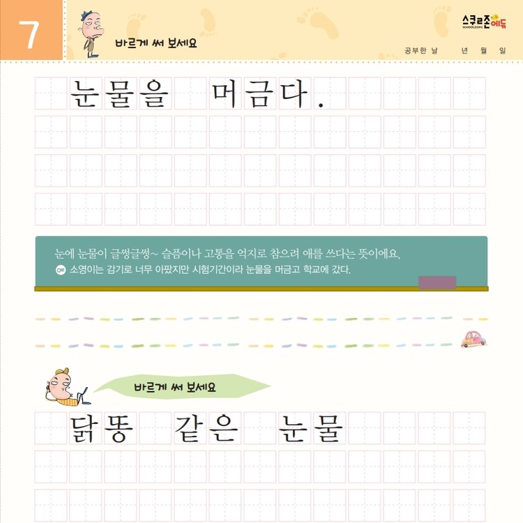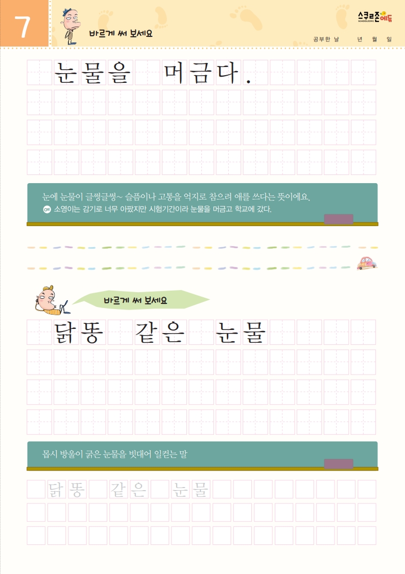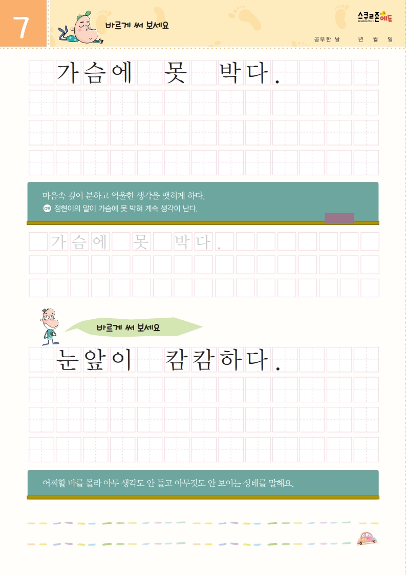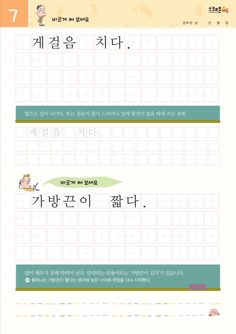 재미있는 관용어를 따라 쓰며 글씨체와 어휘력을 함께 기를 수 있습니다.