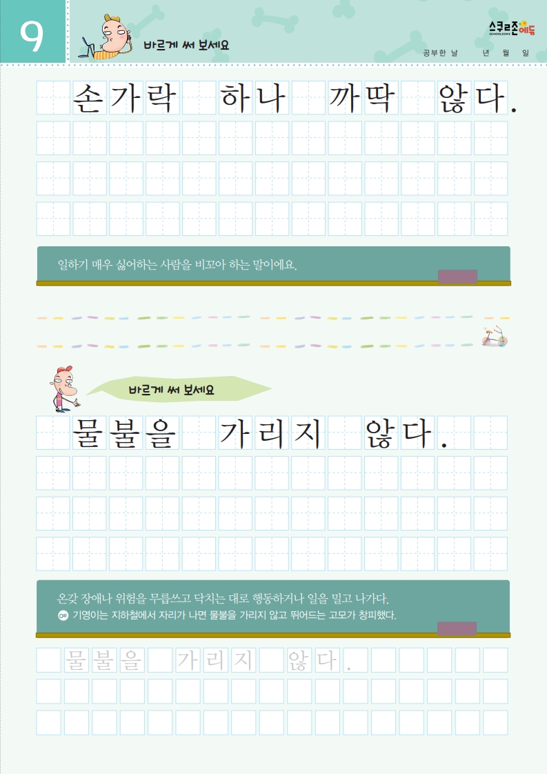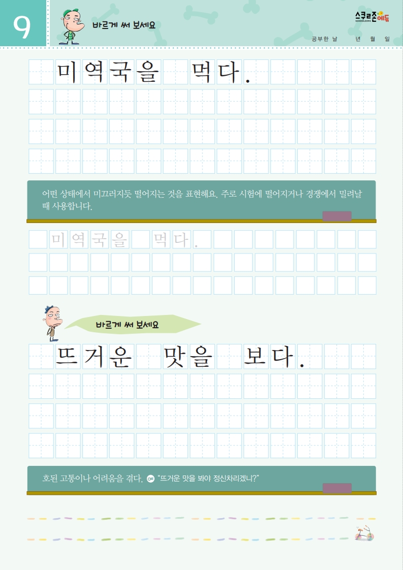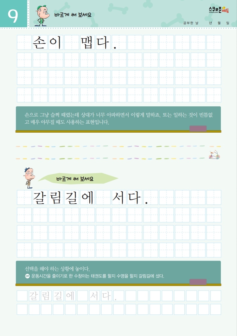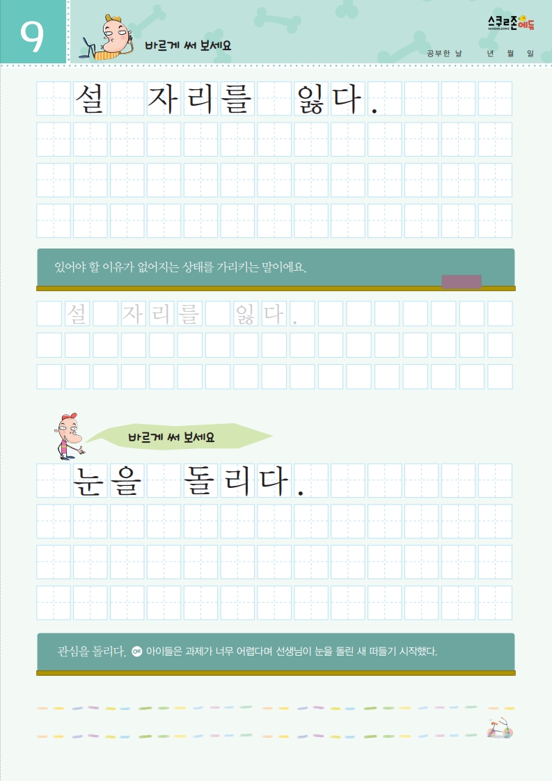 재미있는 관용어를 따라 쓰며 글씨체와 어휘력을 함께 기를 수 있습니다.