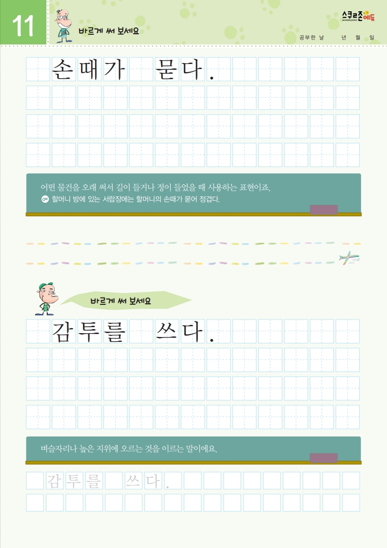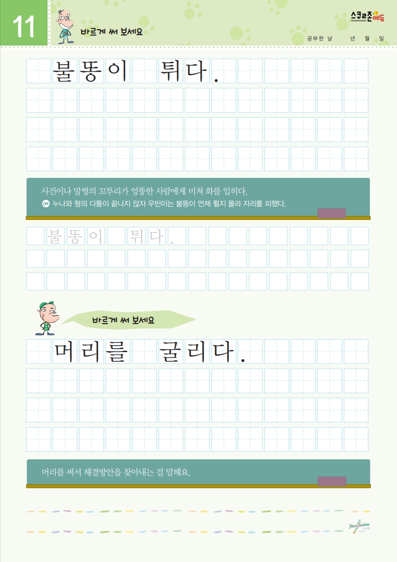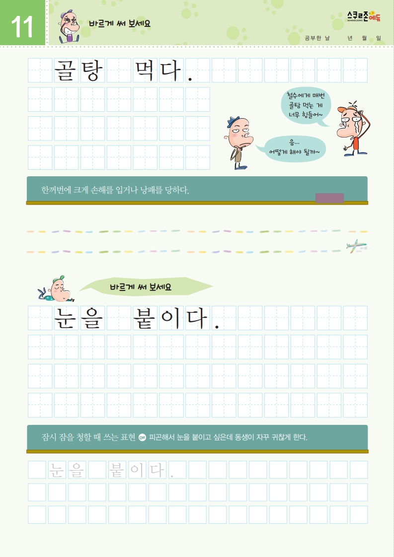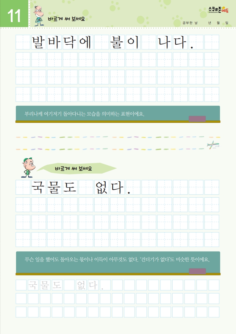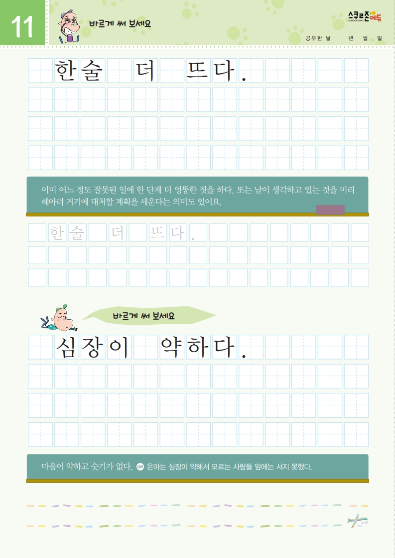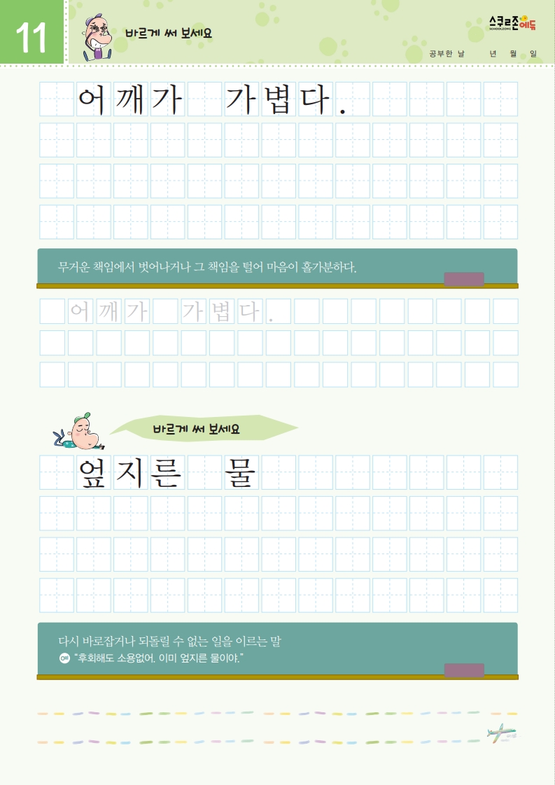재미있는 관용어를 따라 쓰며 글씨체와 어휘력을 함께 기를 수 있습니다.