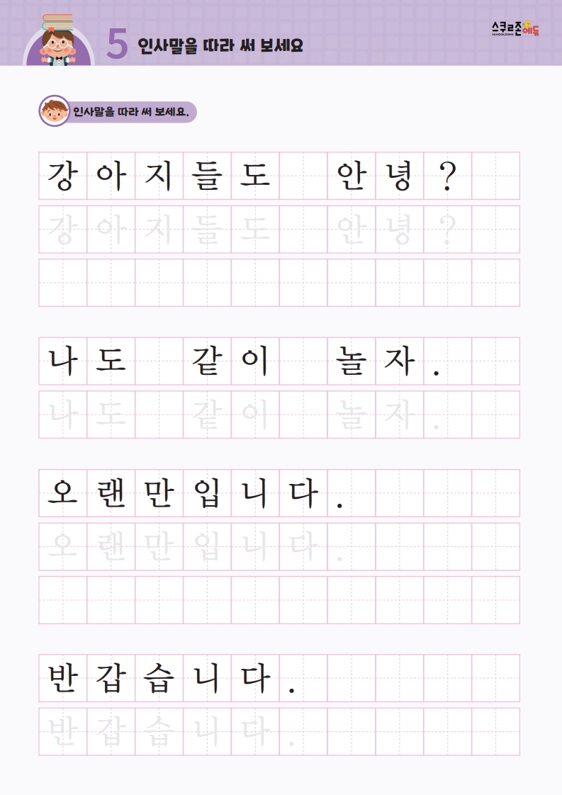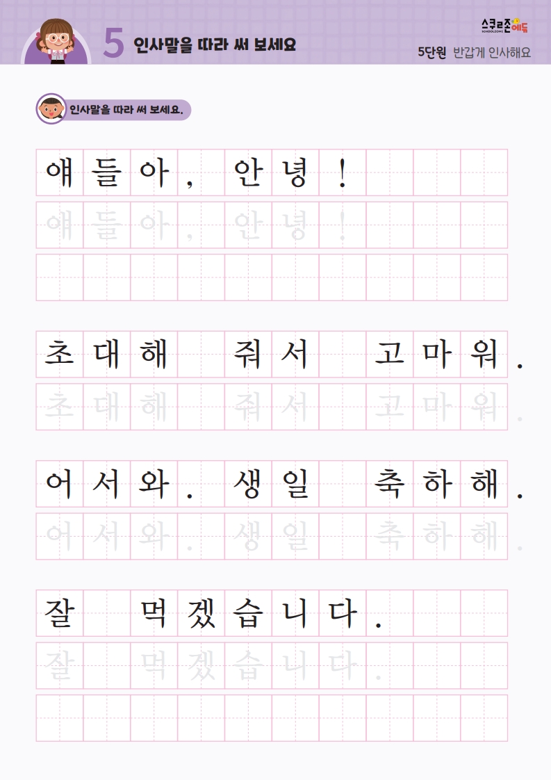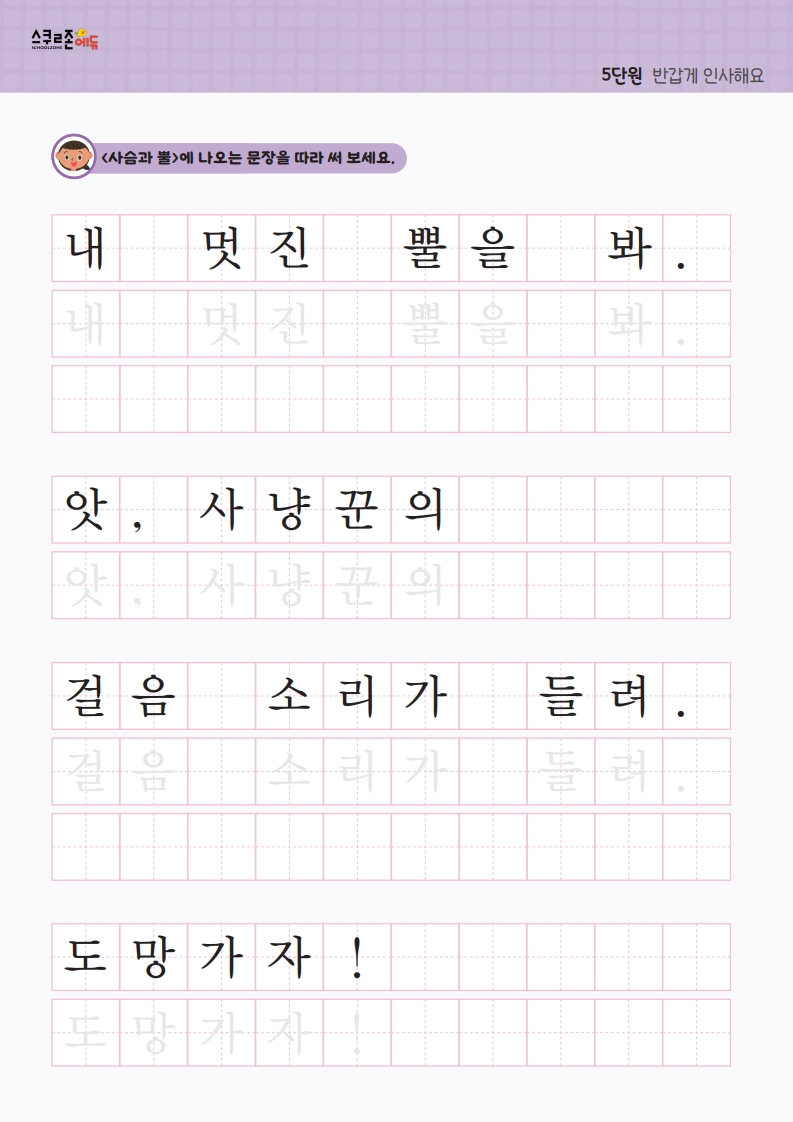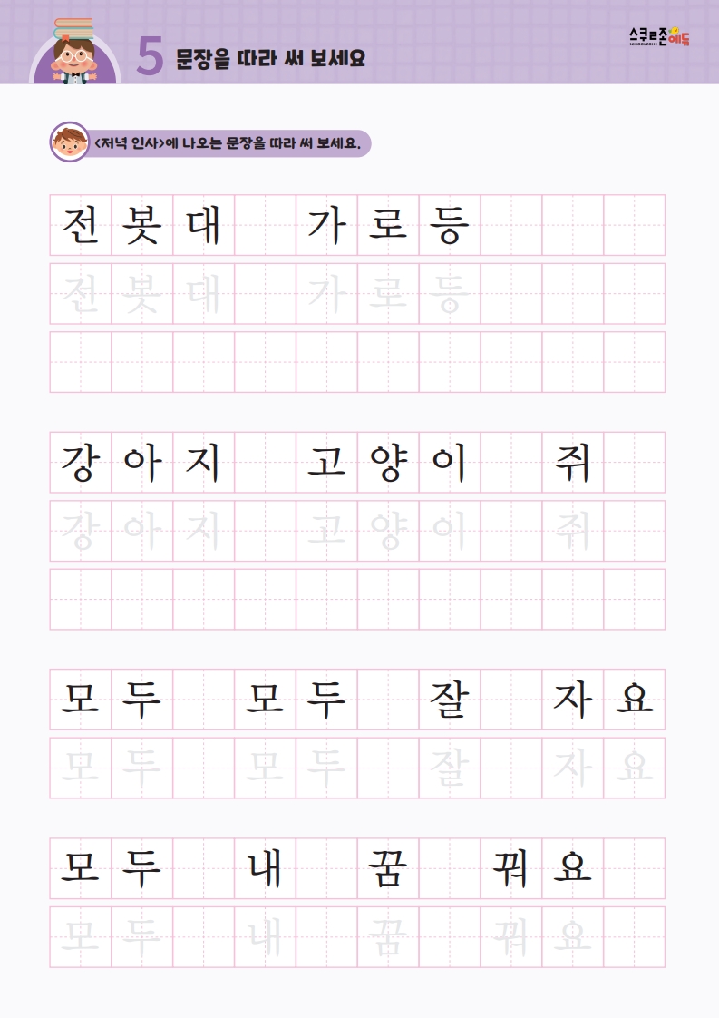 꾸준한 따라쓰기를 통해 손힘, 집중력, 인내심이 자라고 글씨체도 예뻐집니다.