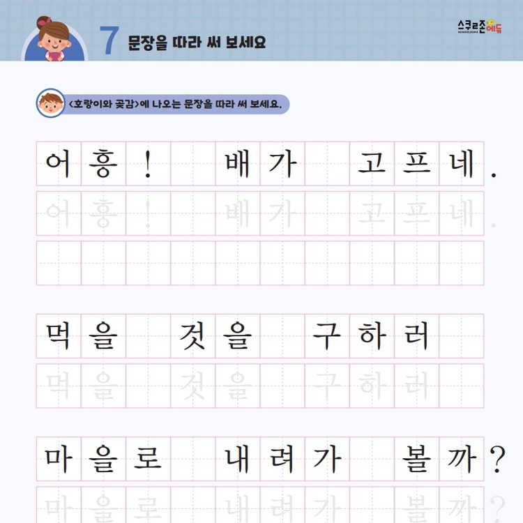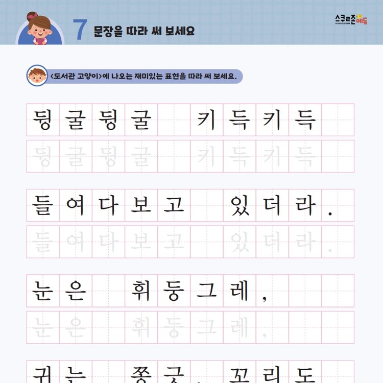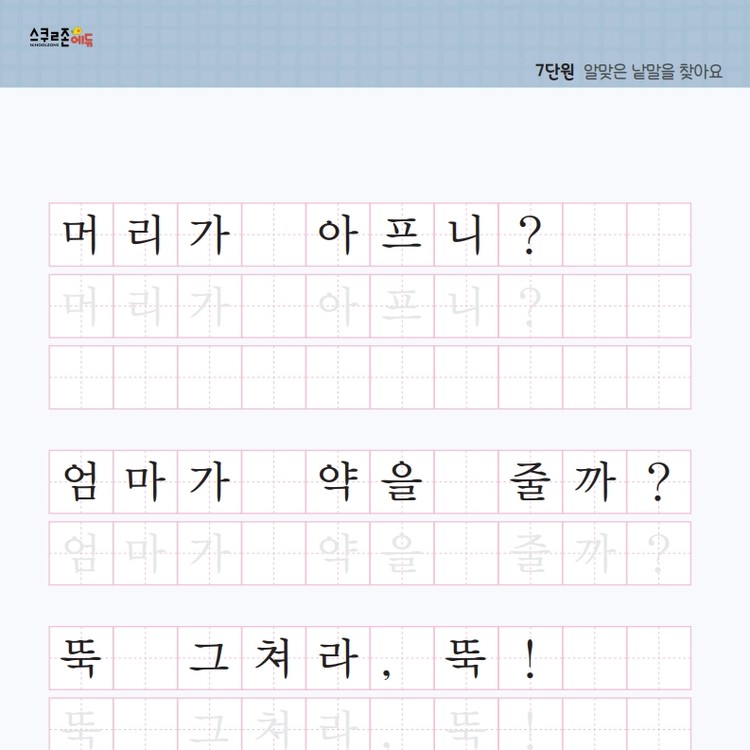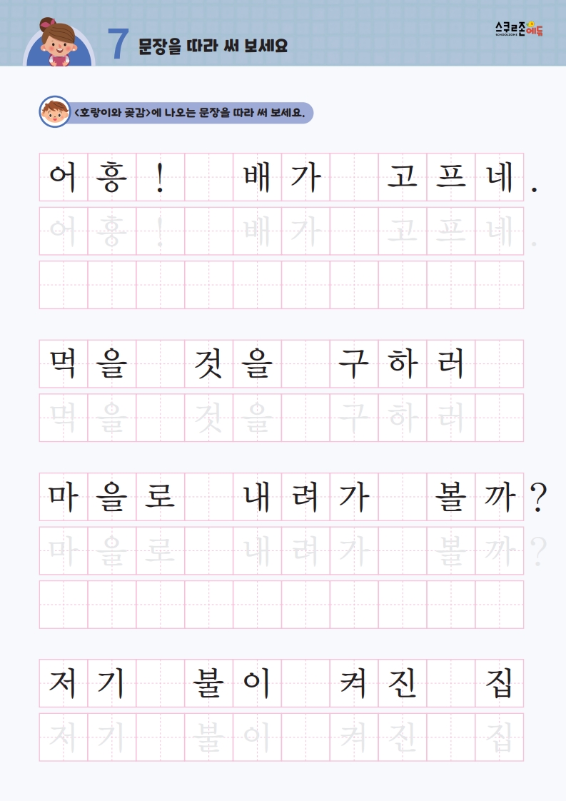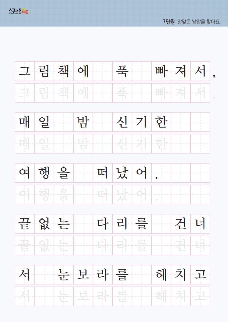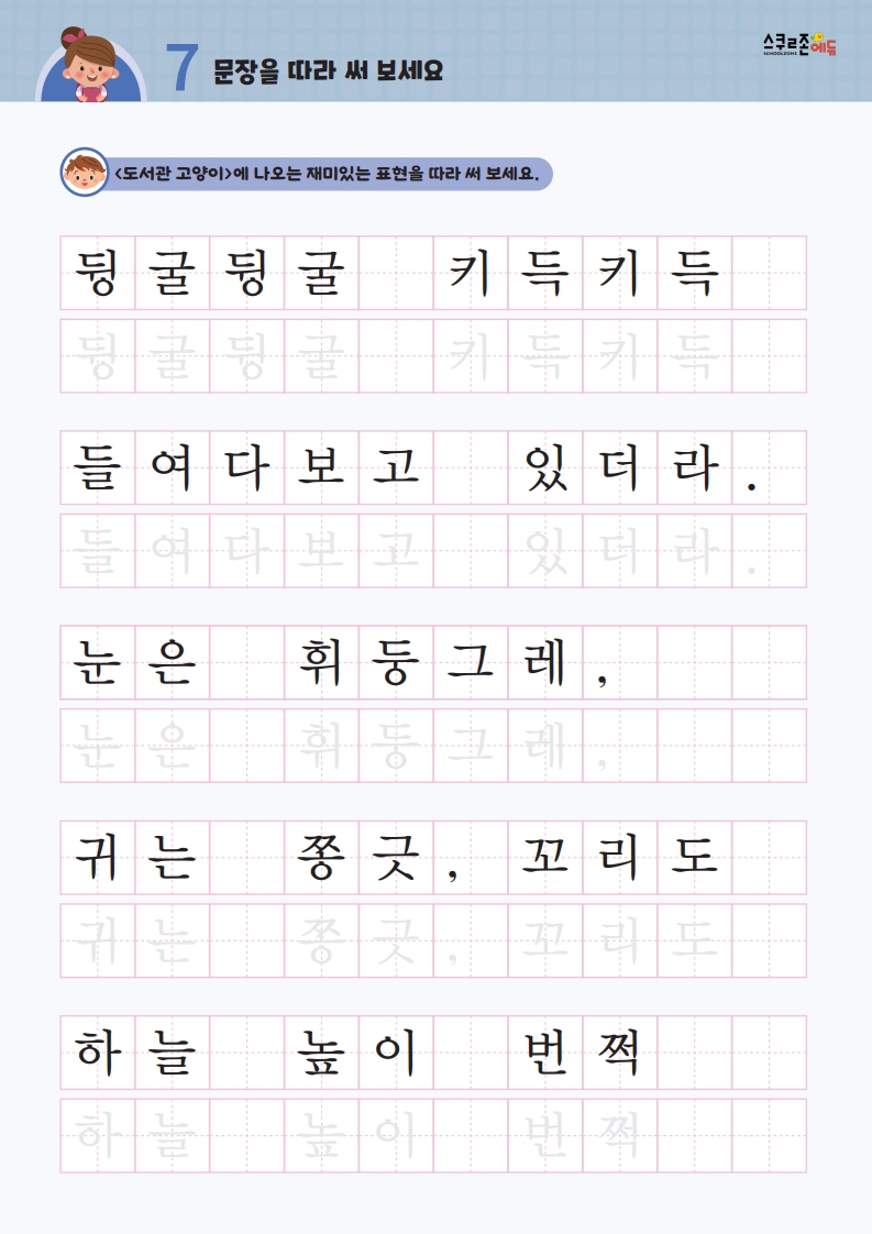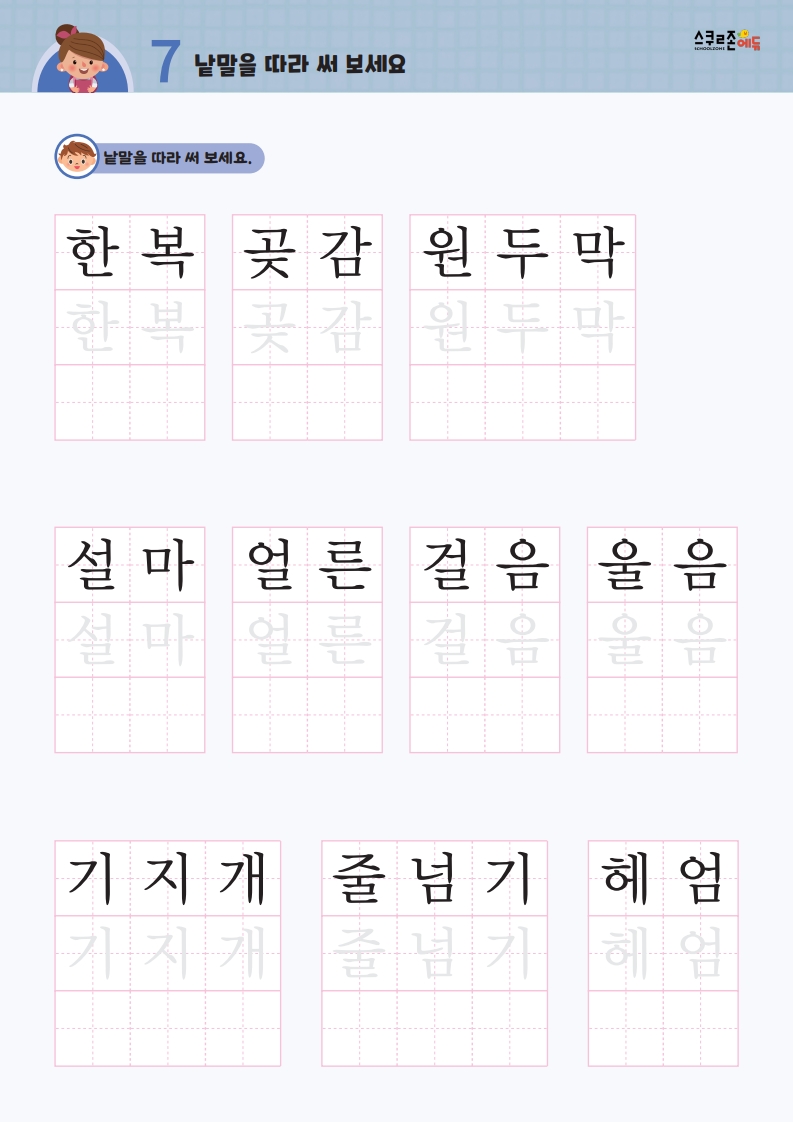 꾸준한 따라쓰기를 통해 손힘, 집중력, 인내심이 자라고 글씨체도 예뻐집니다.