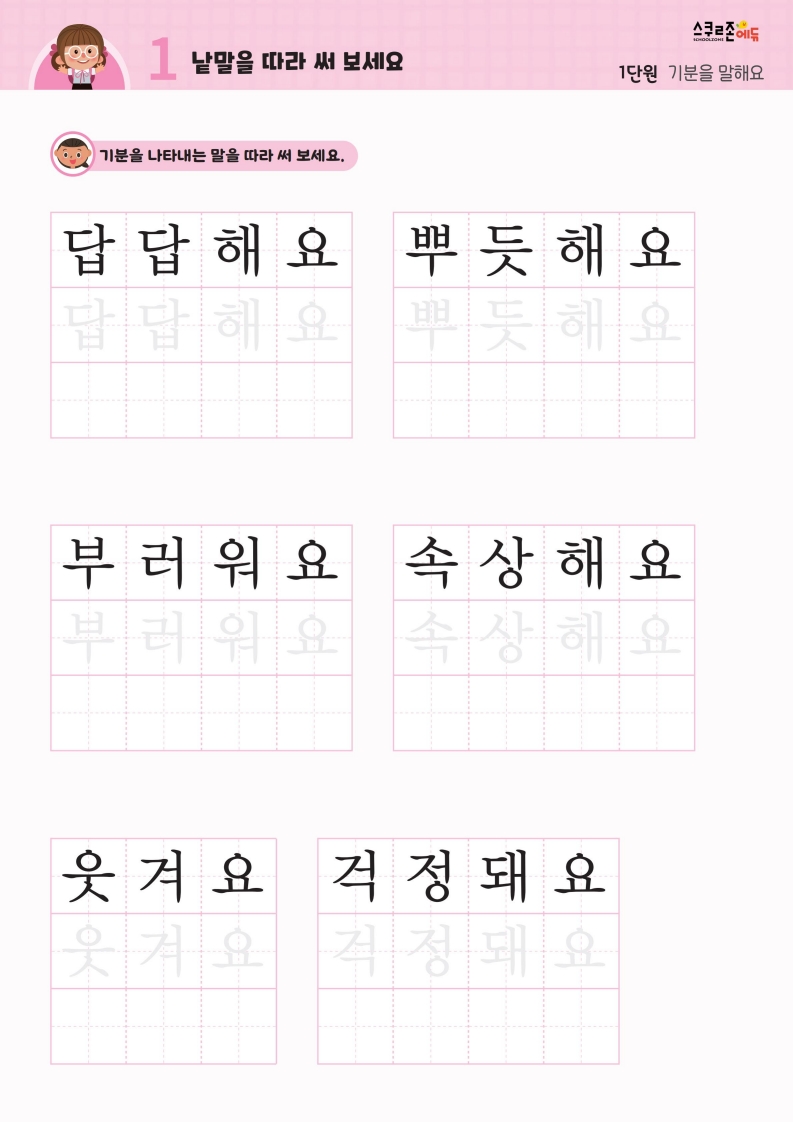 꾸준한 따라쓰기를 통해 손힘, 집중력, 인내심이 자라고 글씨체도 예뻐집니다.