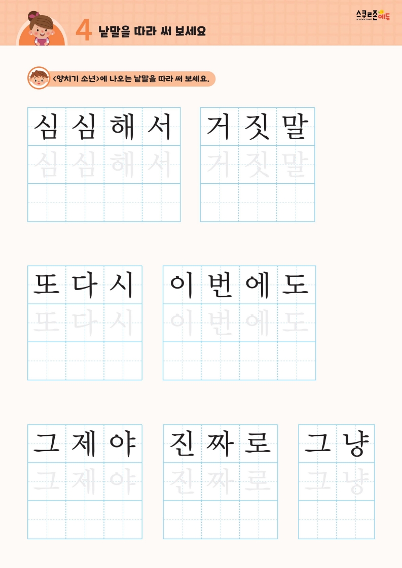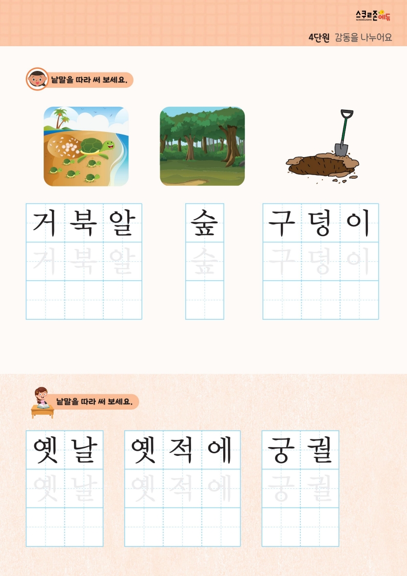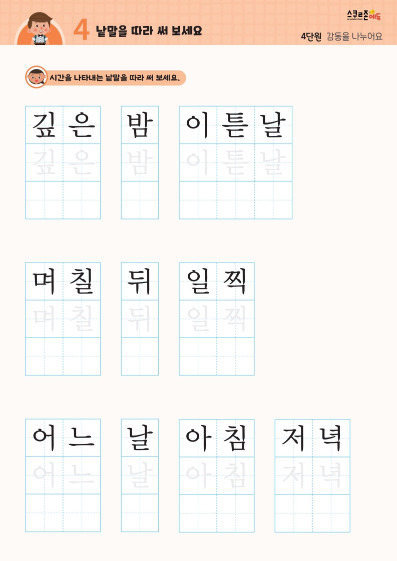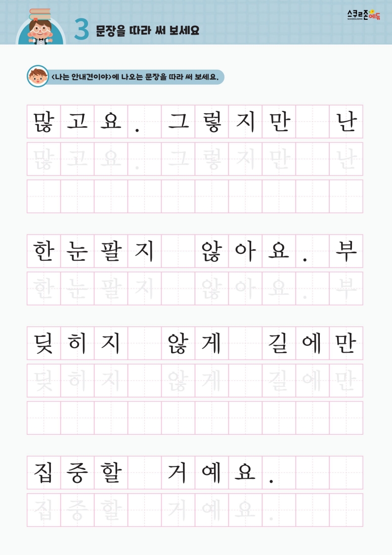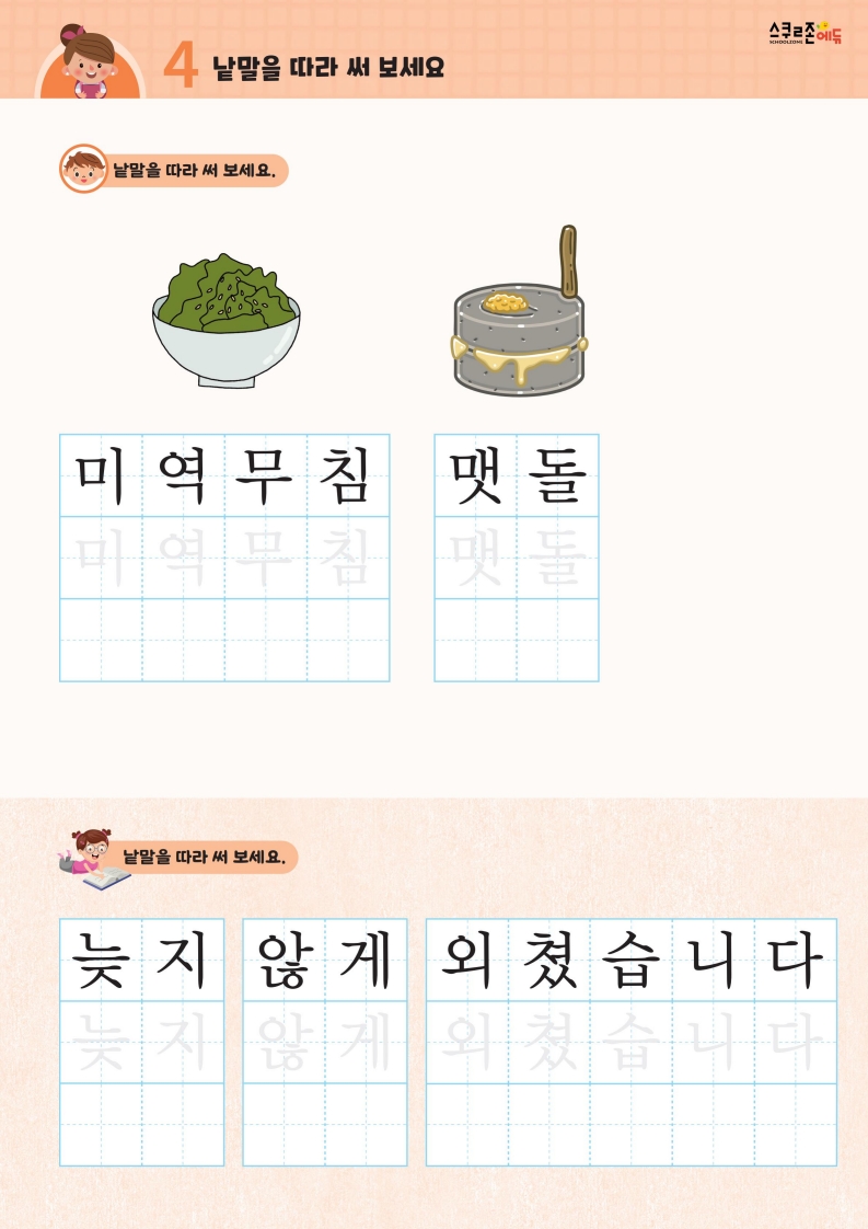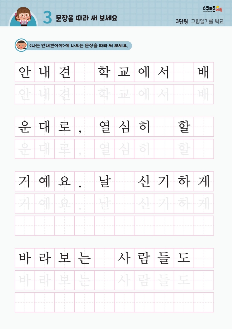 꾸준한 따라쓰기를 통해 손힘, 집중력, 인내심이 자라고 글씨체도 예뻐집니다.
