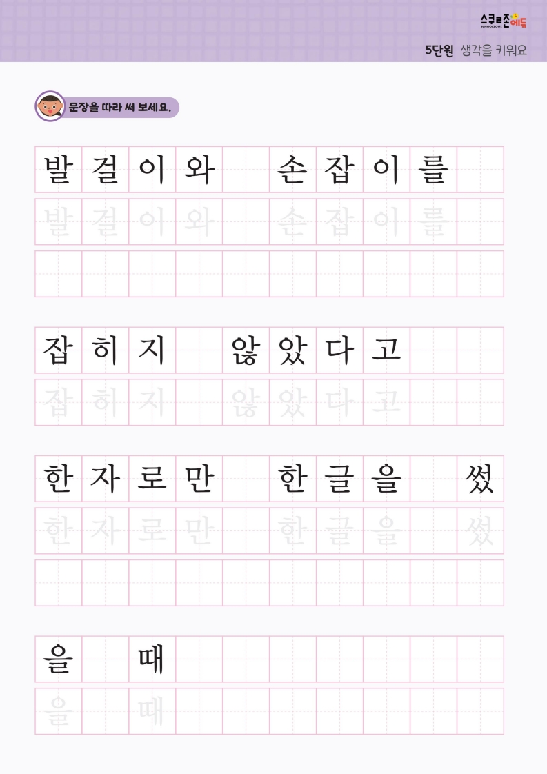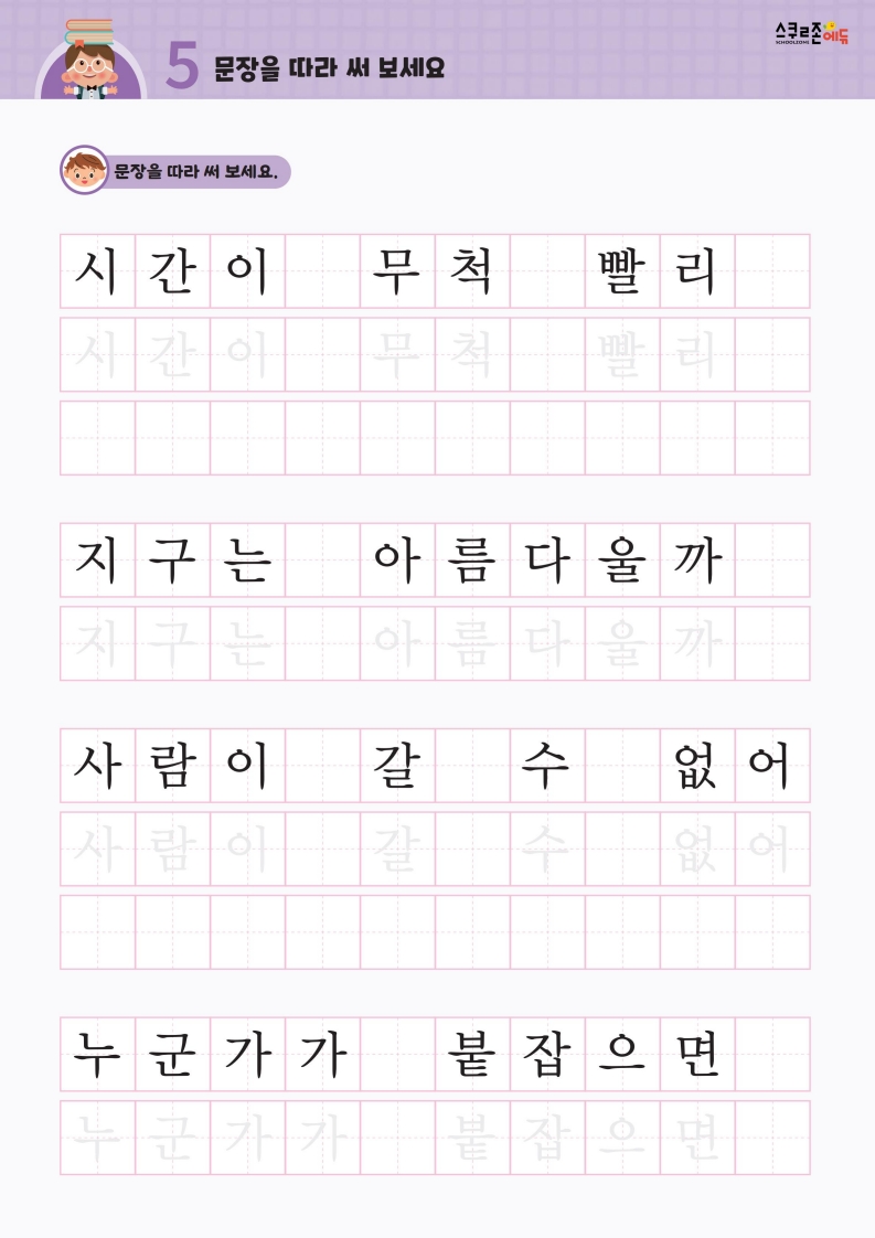꾸준한 따라쓰기를 통해 손힘, 집중력, 인내심이 자라고 글씨체도 예뻐집니다.
