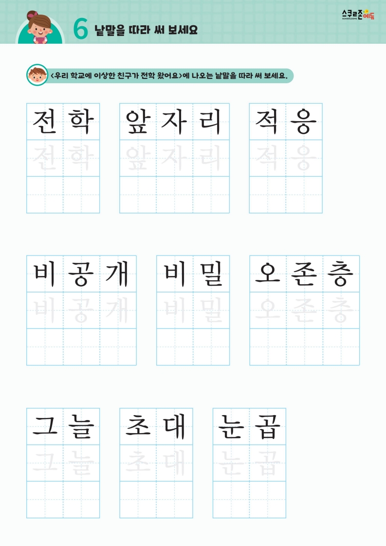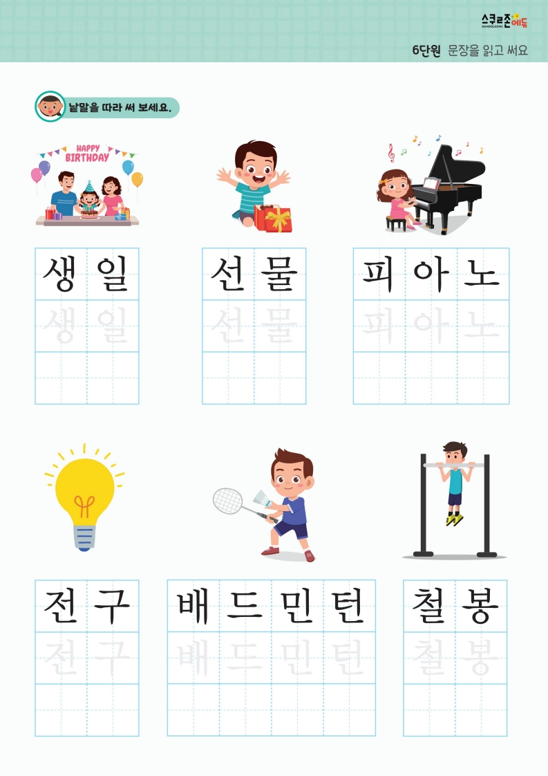 자음 · 모음부터 문장까지 체계적으로 쓰기를 연습할 수 있습니다.
