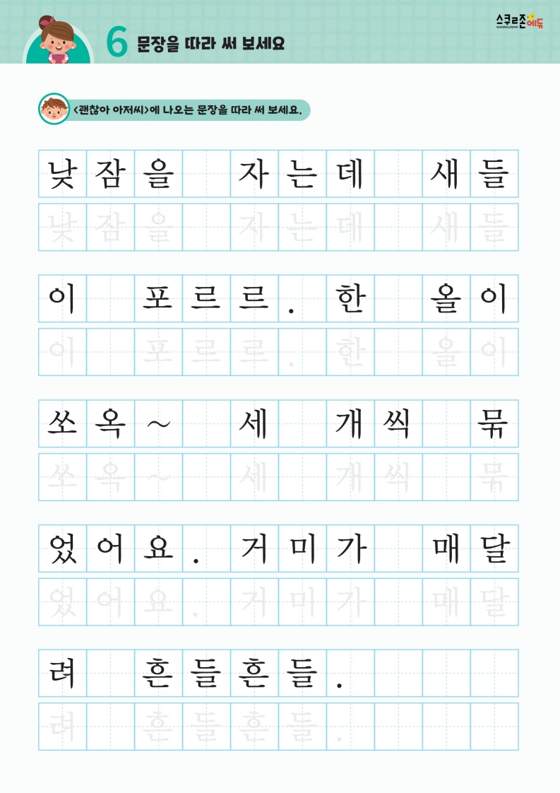 꾸준한 따라쓰기를 통해 손힘, 집중력, 인내심이 자라고 글씨체도 예뻐집니다.