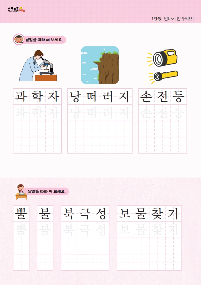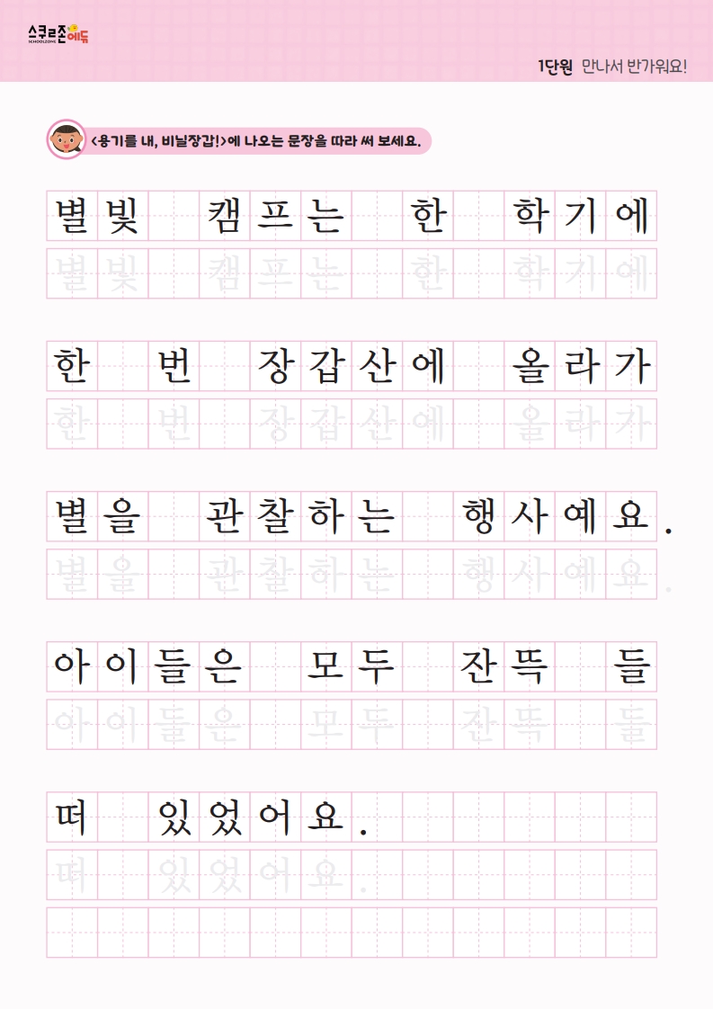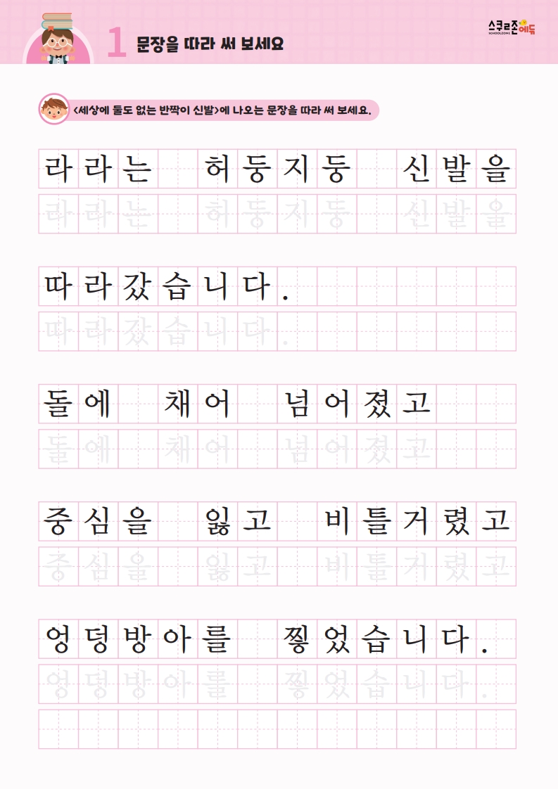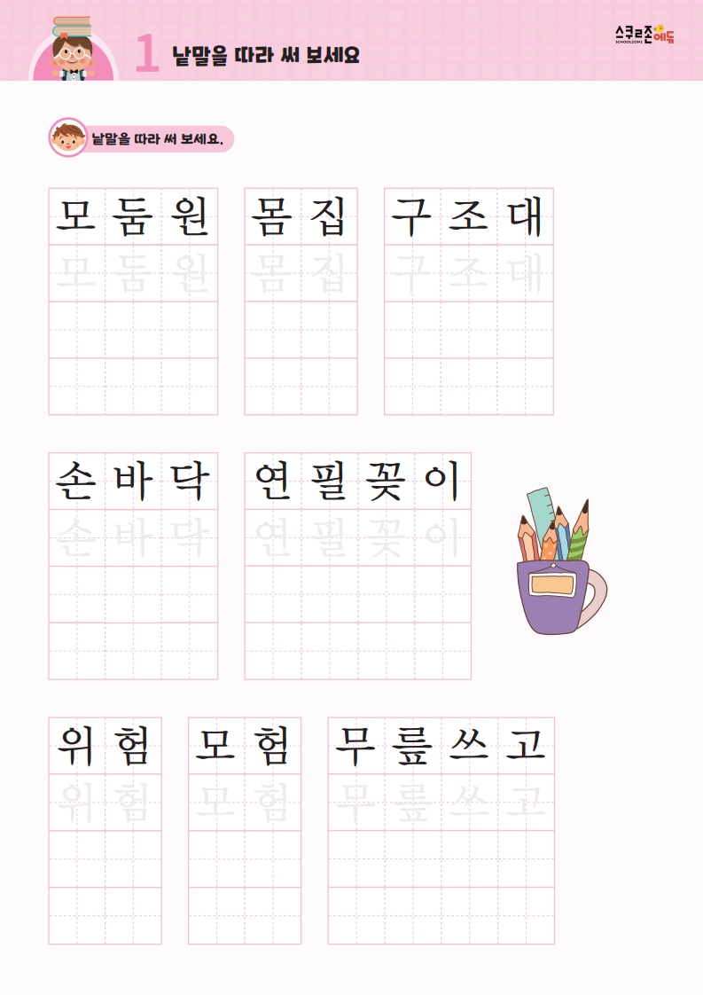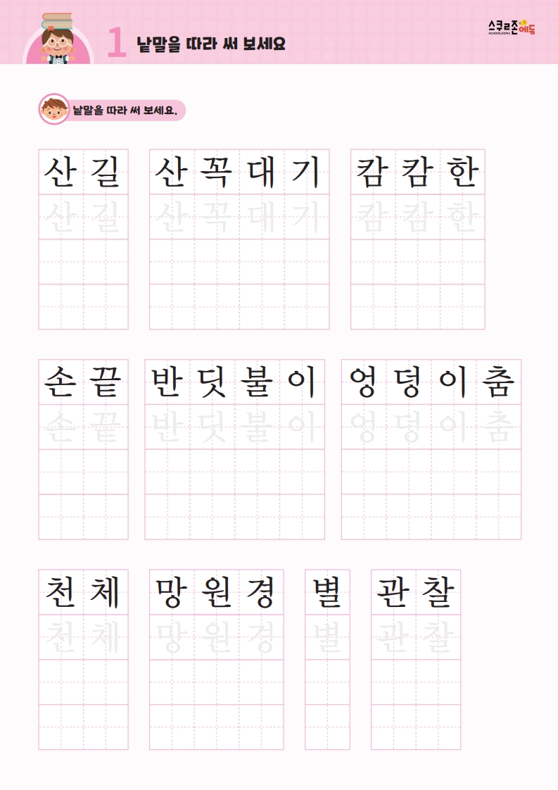 꾸준한 따라쓰기를 통해 손힘, 집중력, 인내심이 자라고 글씨체도 예뻐집니다.