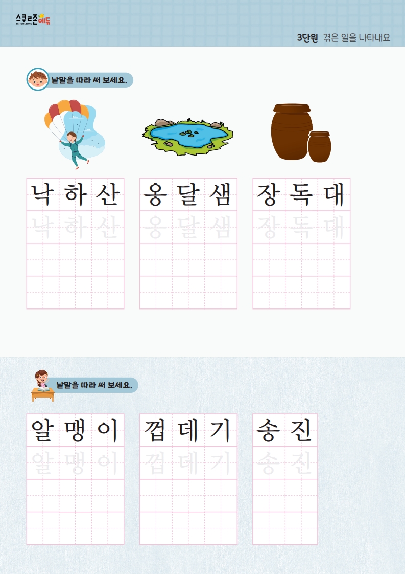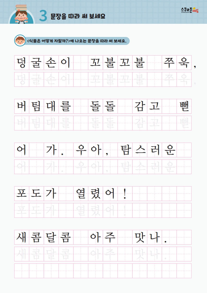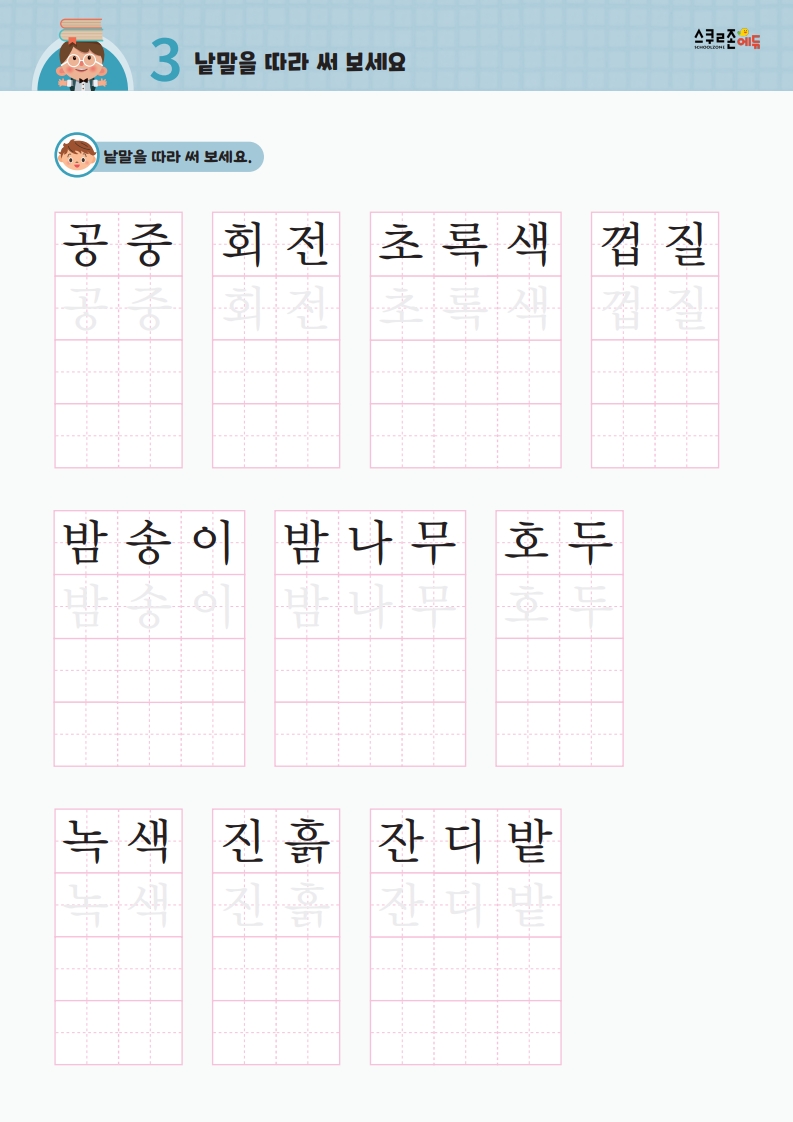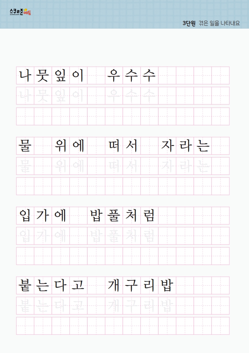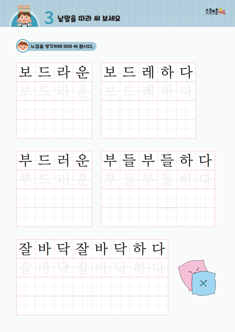 꾸준한 따라쓰기를 통해 손힘, 집중력, 인내심이 자라고 글씨체도 예뻐집니다.