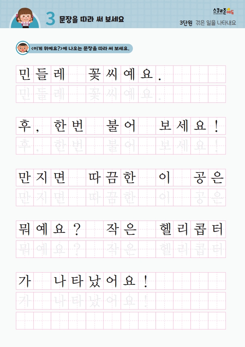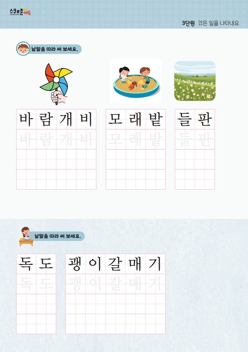 자음 · 모음부터 문장까지 체계적으로 쓰기를 연습할 수 있습니다.