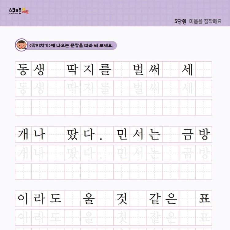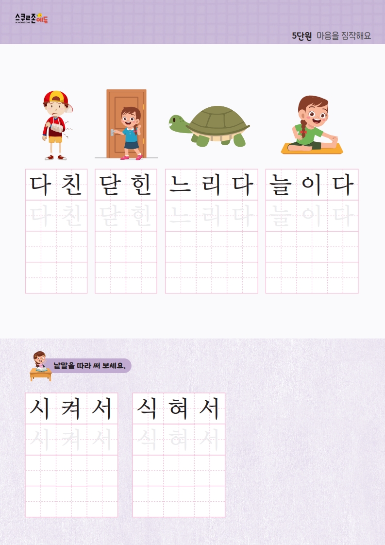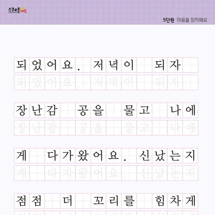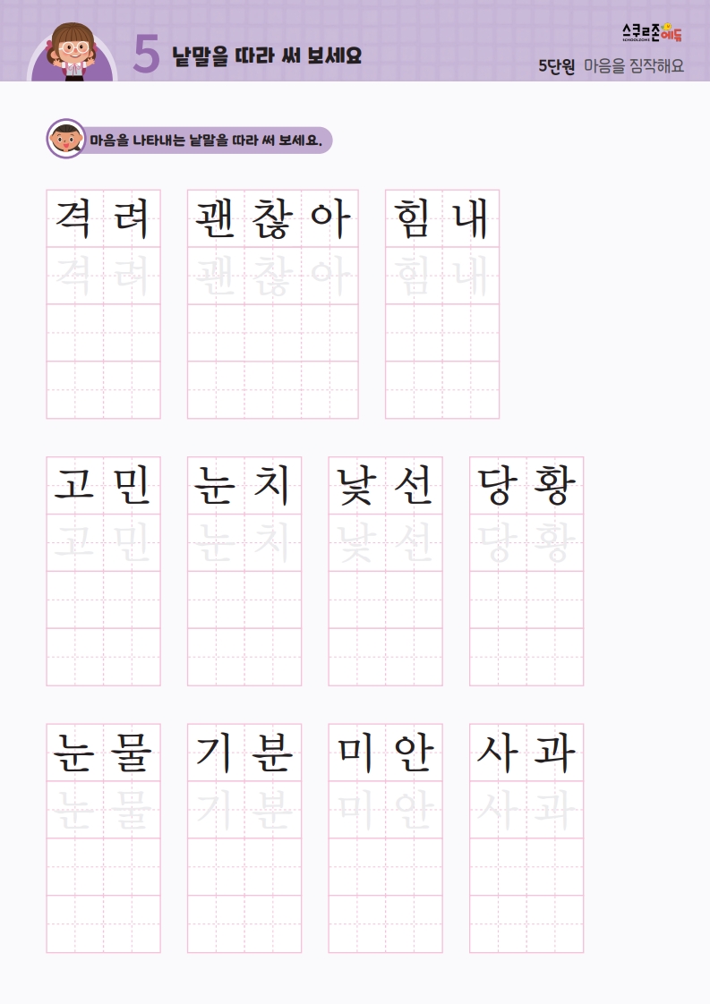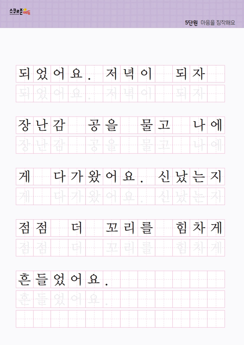 꾸준한 따라쓰기를 통해 손힘, 집중력, 인내심이 자라고 글씨체도 예뻐집니다.