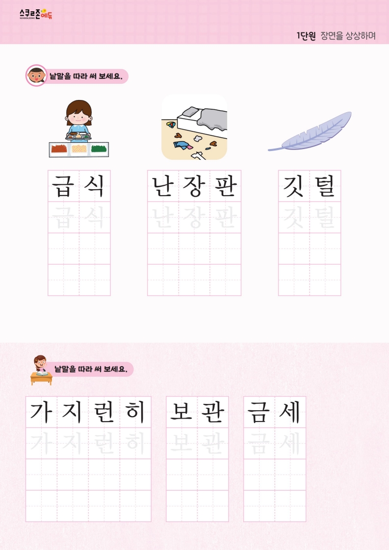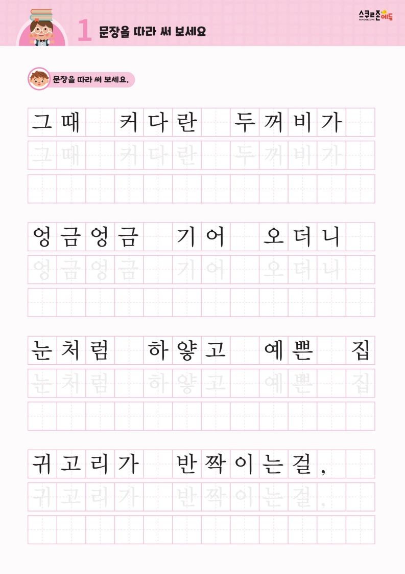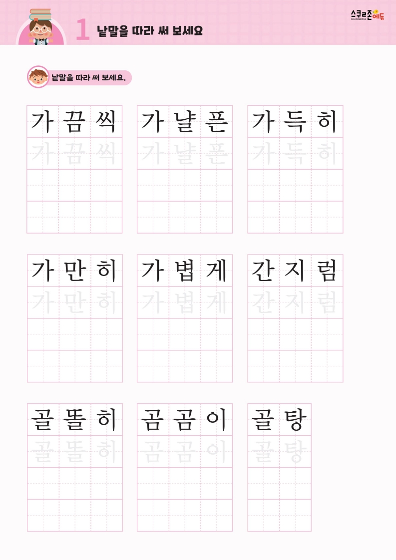 꾸준한 따라쓰기를 통해 손힘, 집중력, 인내심이 자라고 글씨체도 예뻐집니다.