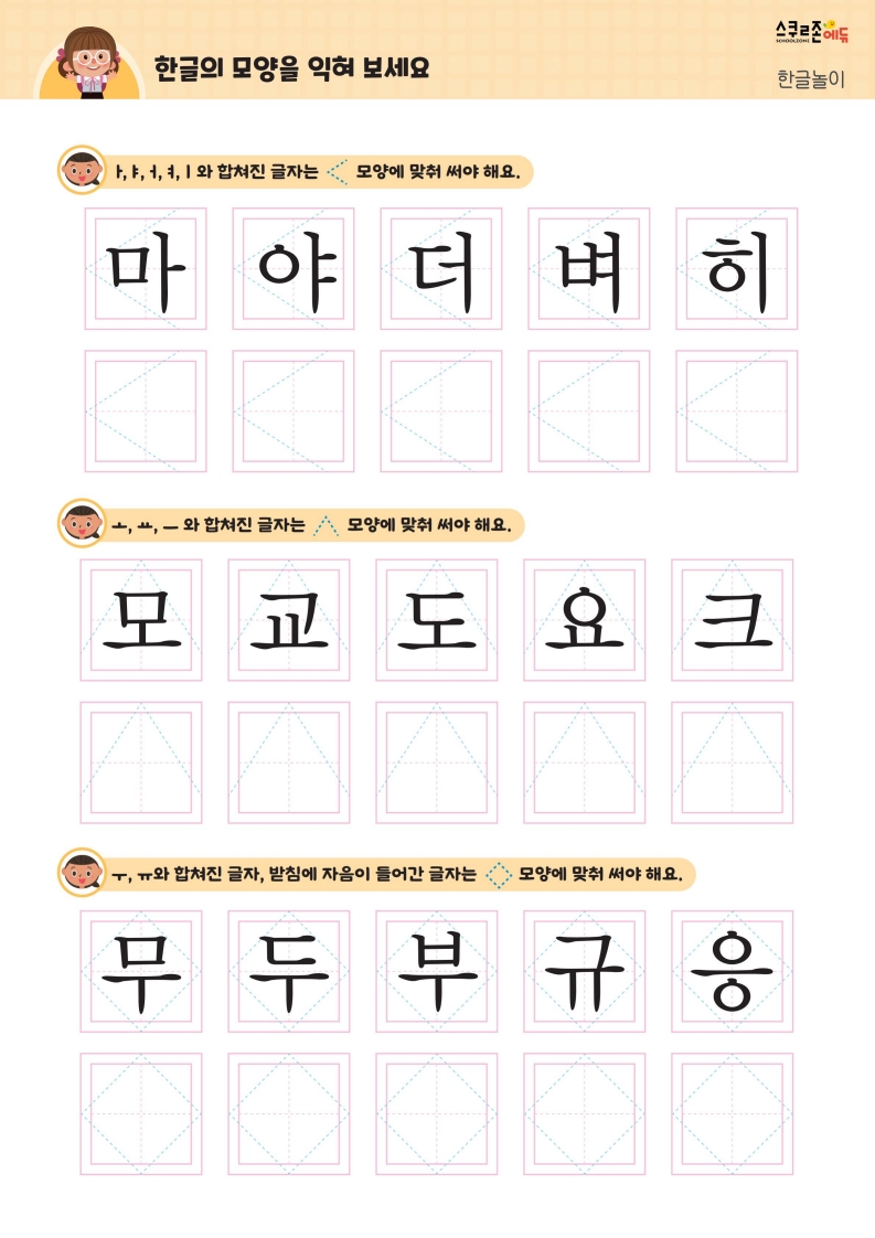 자음 · 모음부터 문장까지 체계적으로 쓰기를 연습할 수 있습니다.