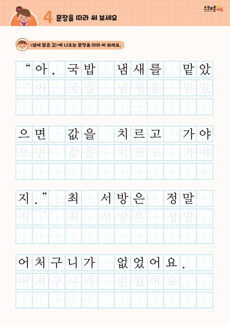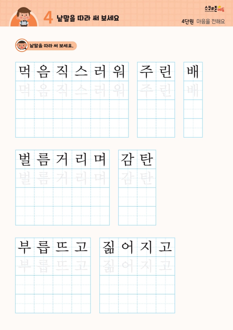 꾸준한 따라쓰기를 통해 손힘, 집중력, 인내심이 자라고 글씨체도 예뻐집니다.