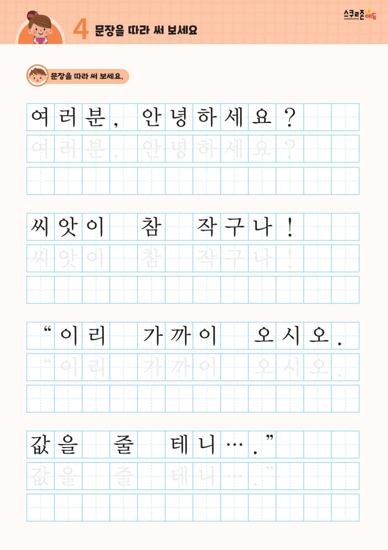 자음 · 모음부터 문장까지 체계적으로 쓰기를 연습할 수 있습니다.
