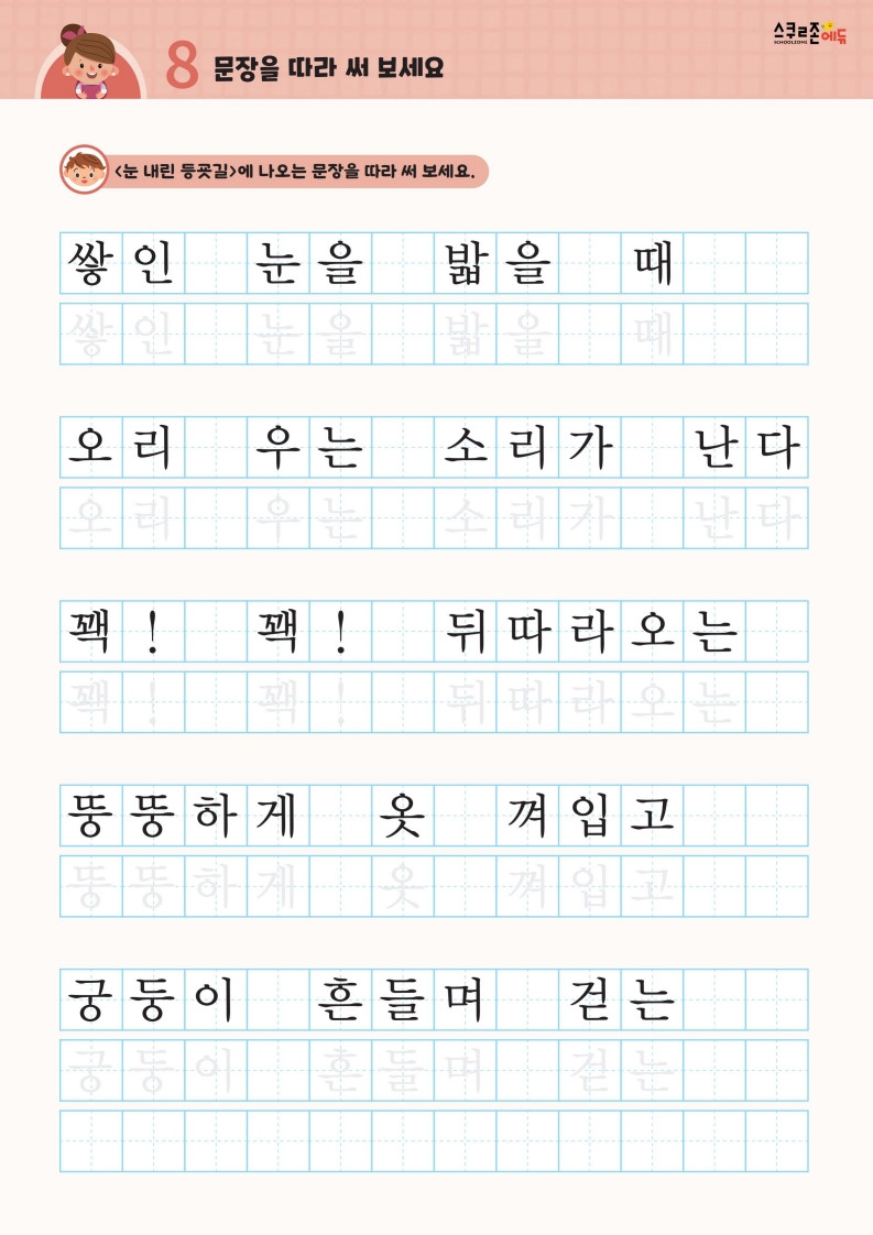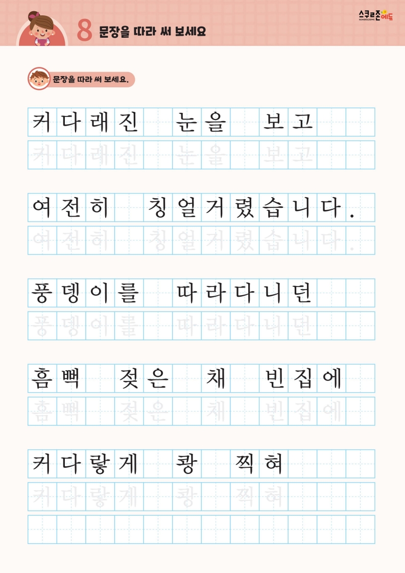 꾸준한 따라쓰기를 통해 손힘, 집중력, 인내심이 자라고 글씨체도 예뻐집니다.