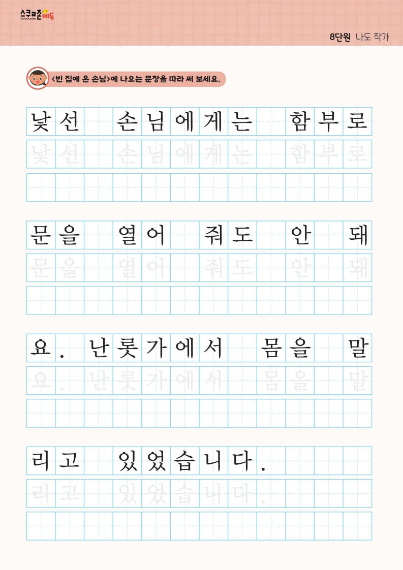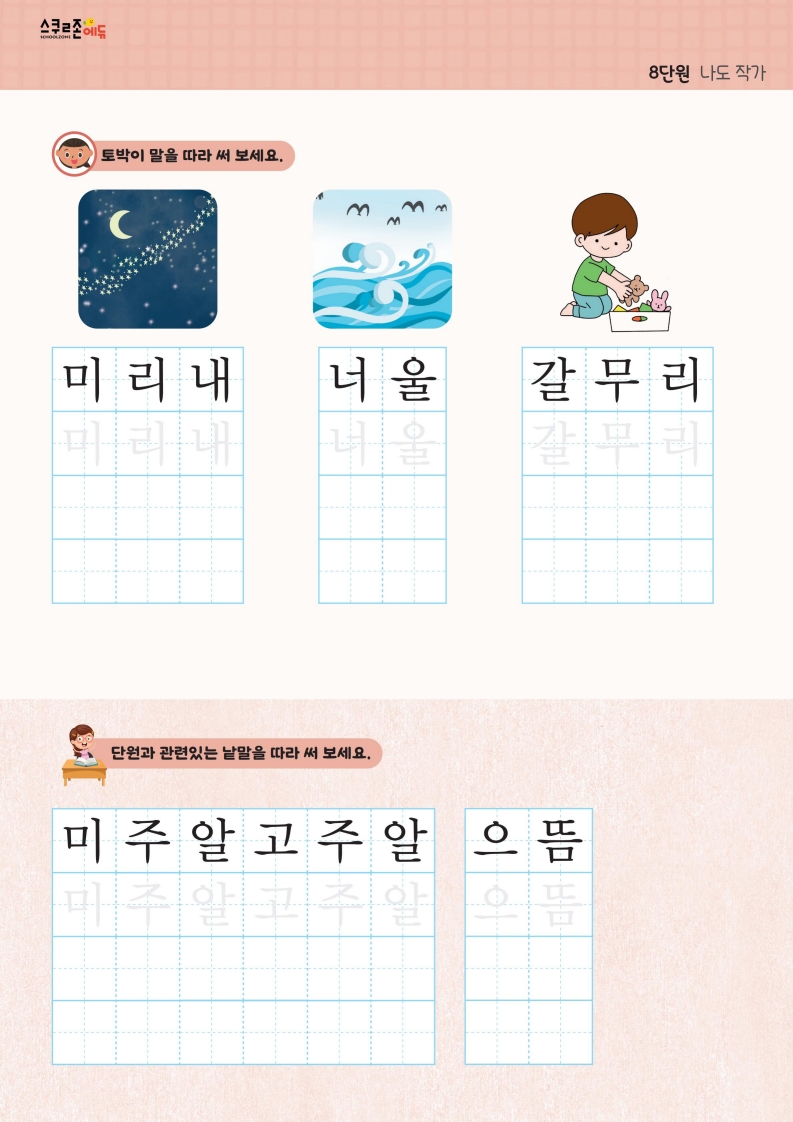 자음 · 모음부터 문장까지 체계적으로 쓰기를 연습할 수 있습니다.