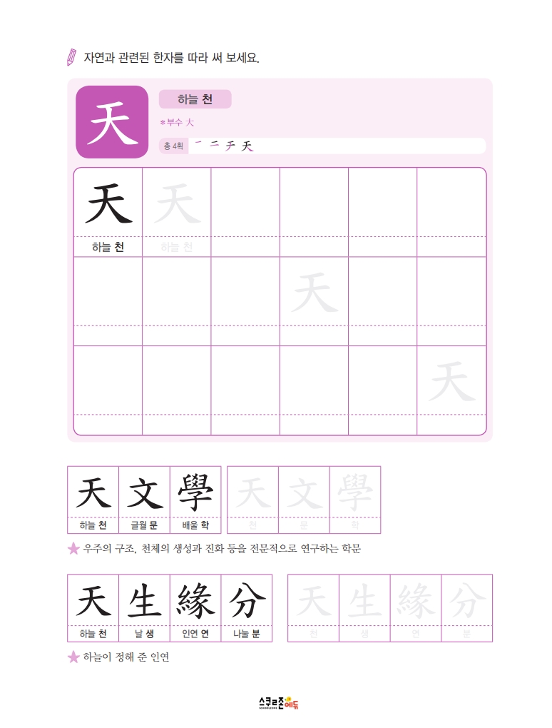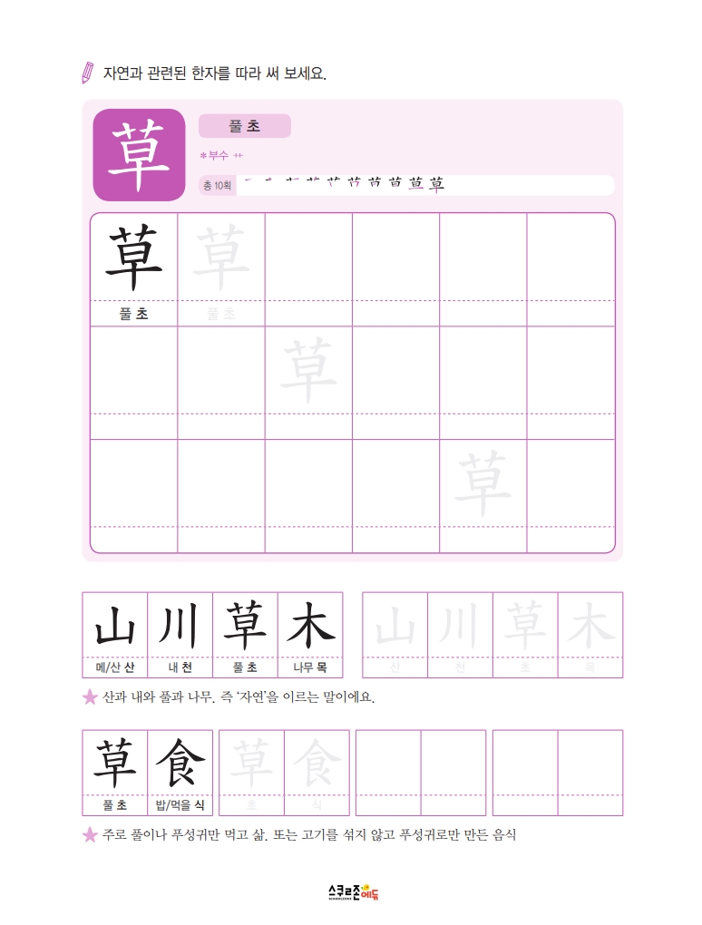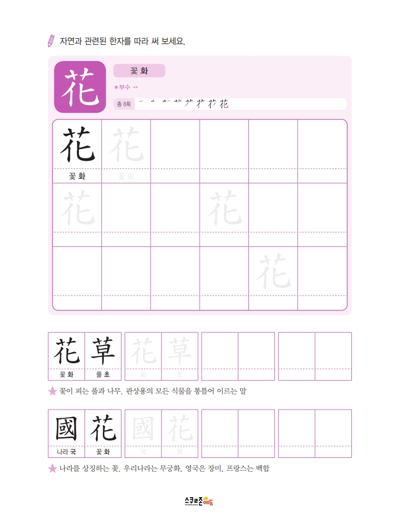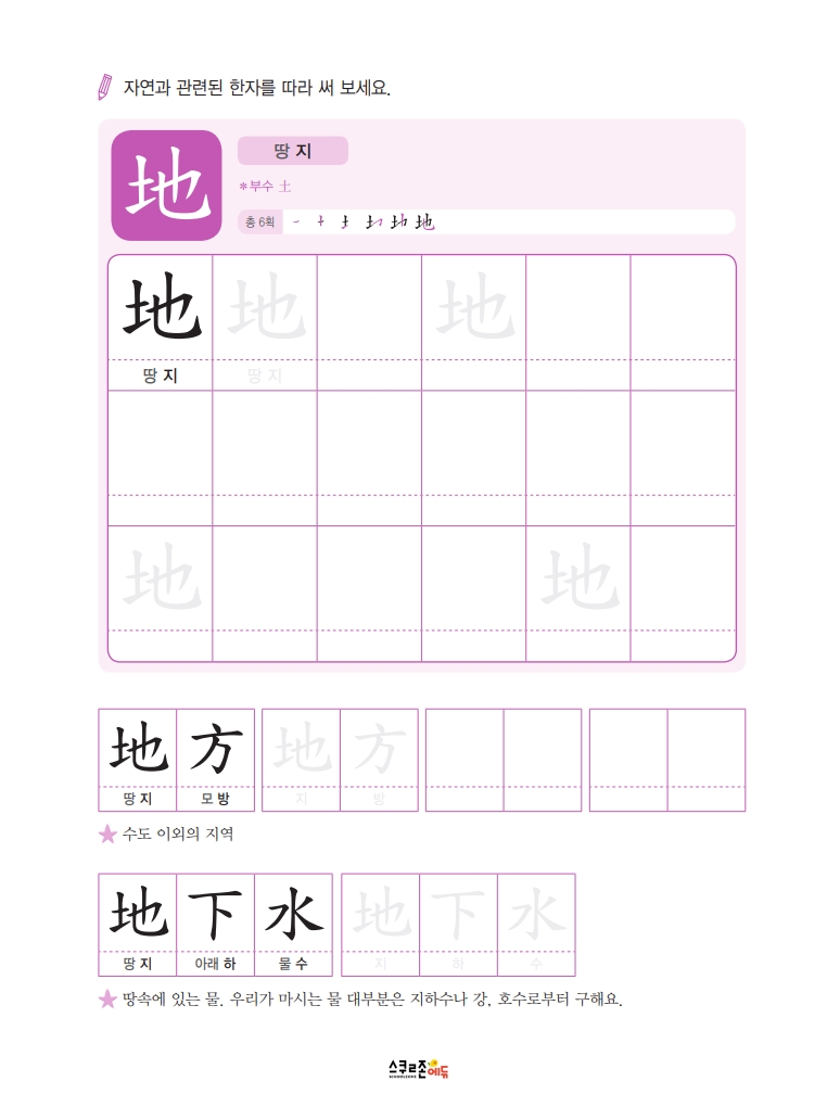 따라쓰기는 단순 반복 대신 한자가 포함된 어휘를 함께 쓰며 학습 효과를 높여요.