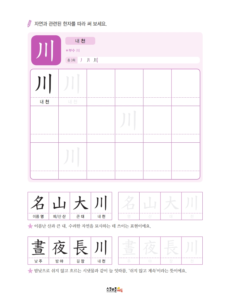 하루 하루 꾸준히 쓰면 7급 신출한자 50자를 자연스럽게 익힐 수 있어요.