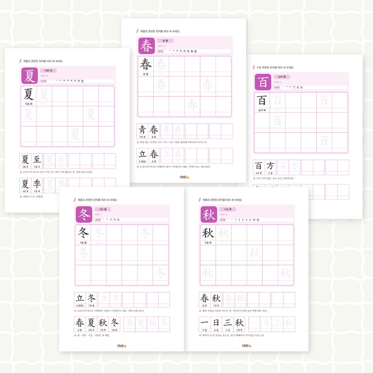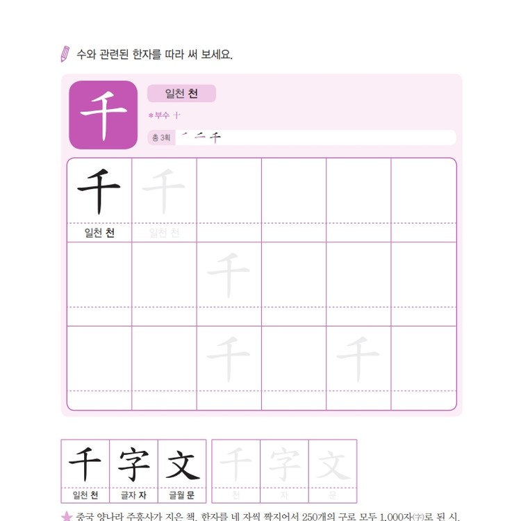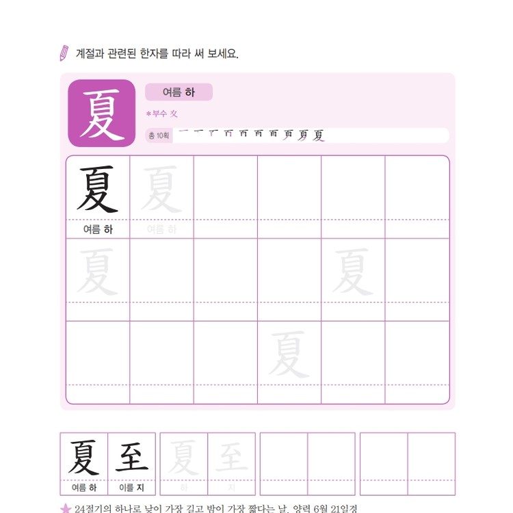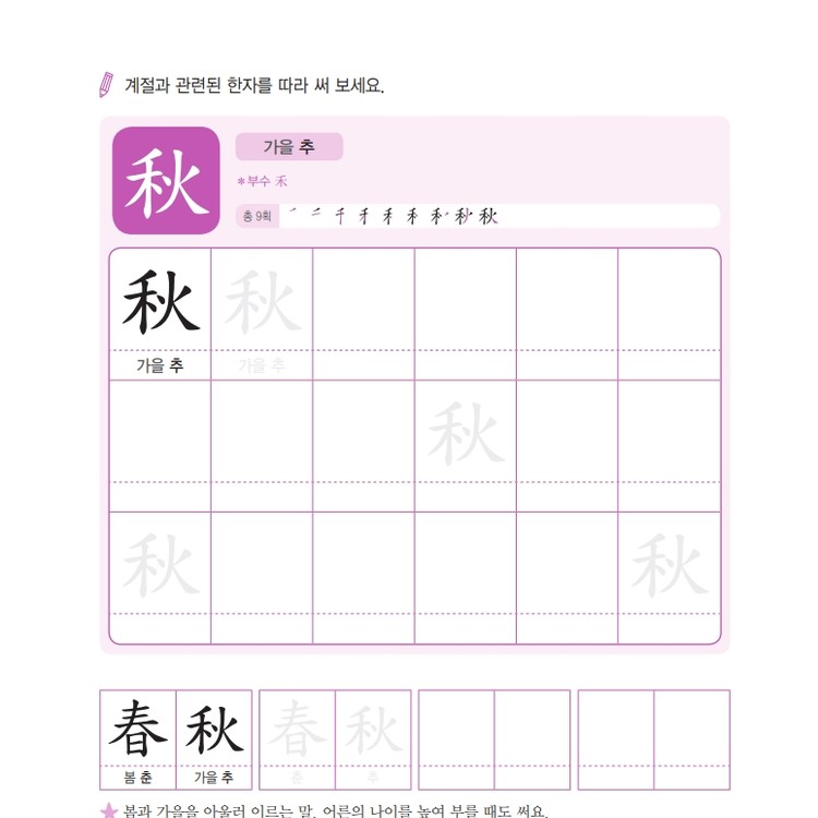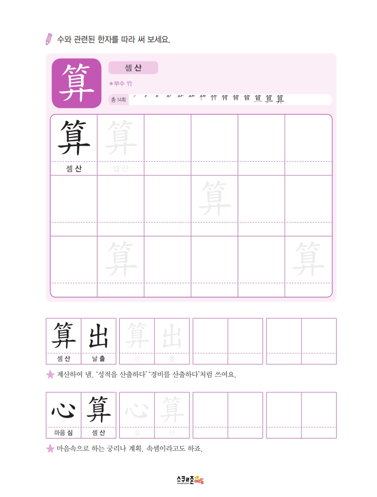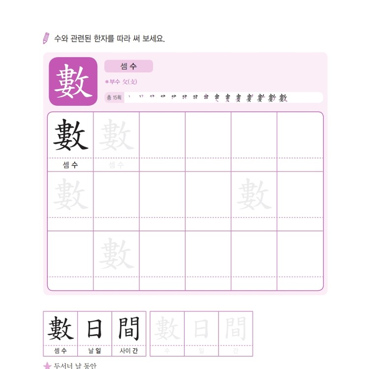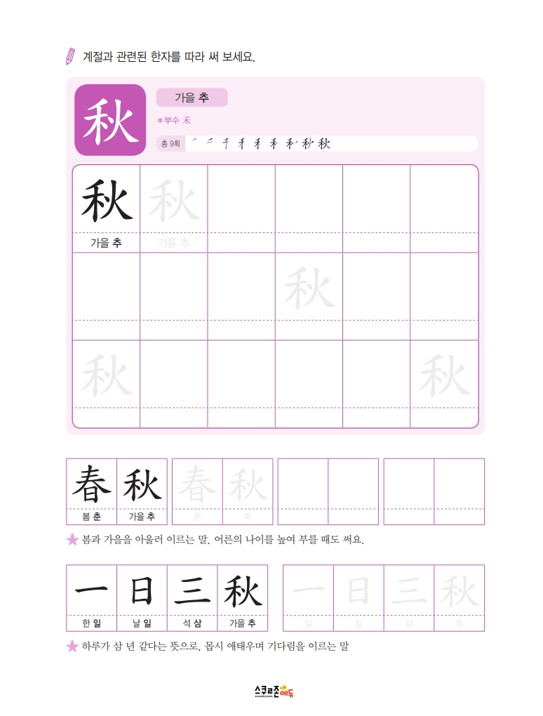 따라쓰기는 단순 반복 대신 한자가 포함된 어휘를 함께 쓰며 학습 효과를 높여요.