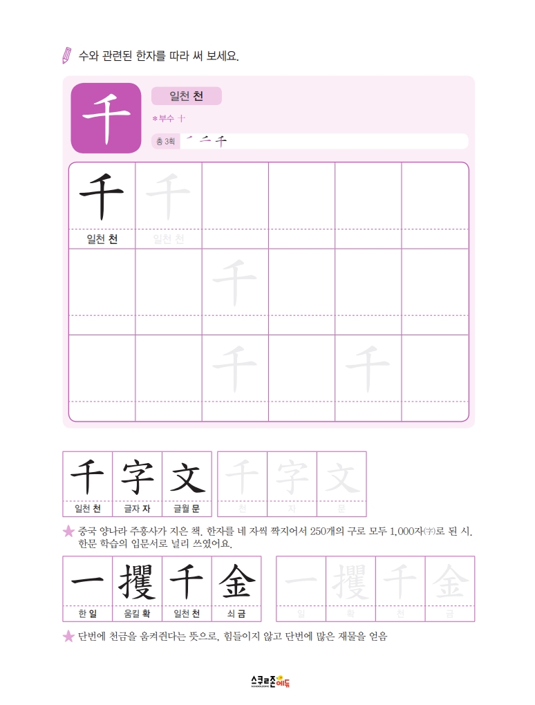 한자의 모양 · 소리 · 뜻을 연결하며 어휘력과 문해력이 동시에 강화돼요.