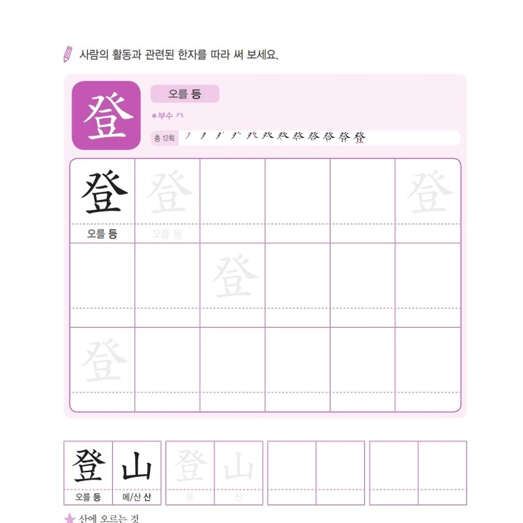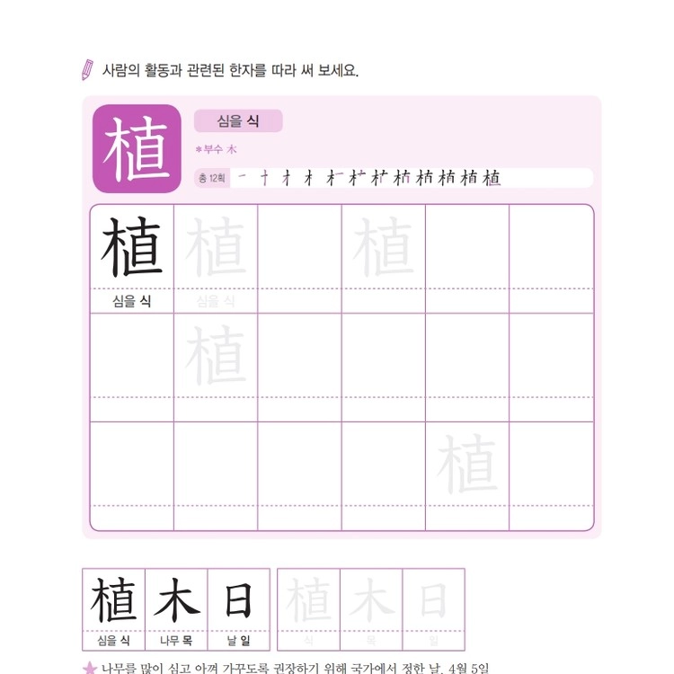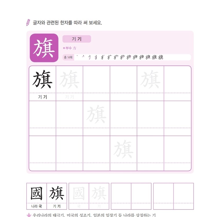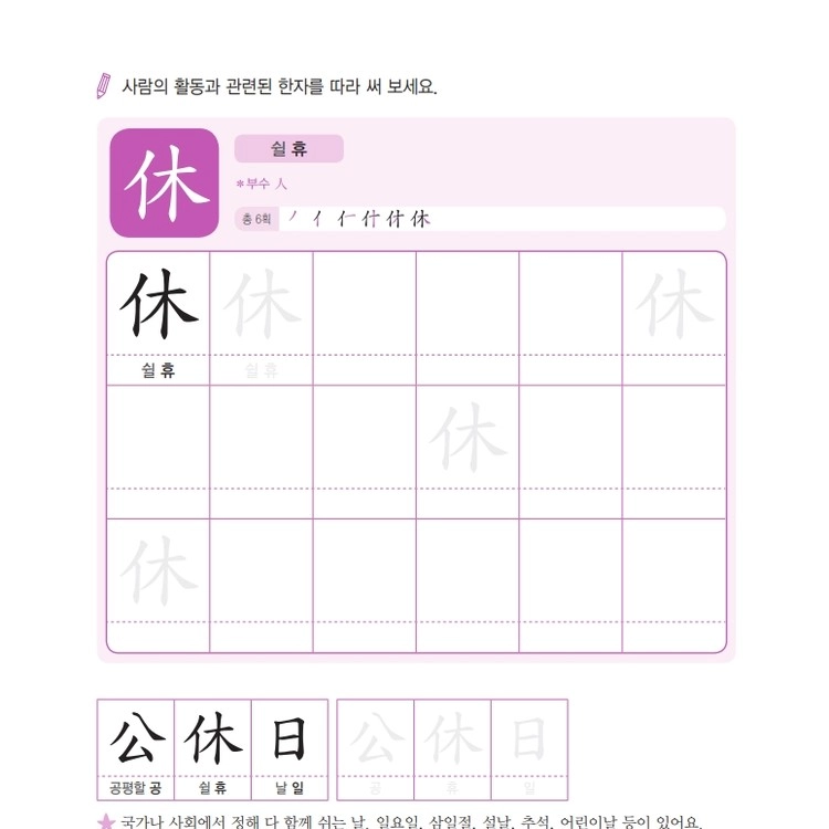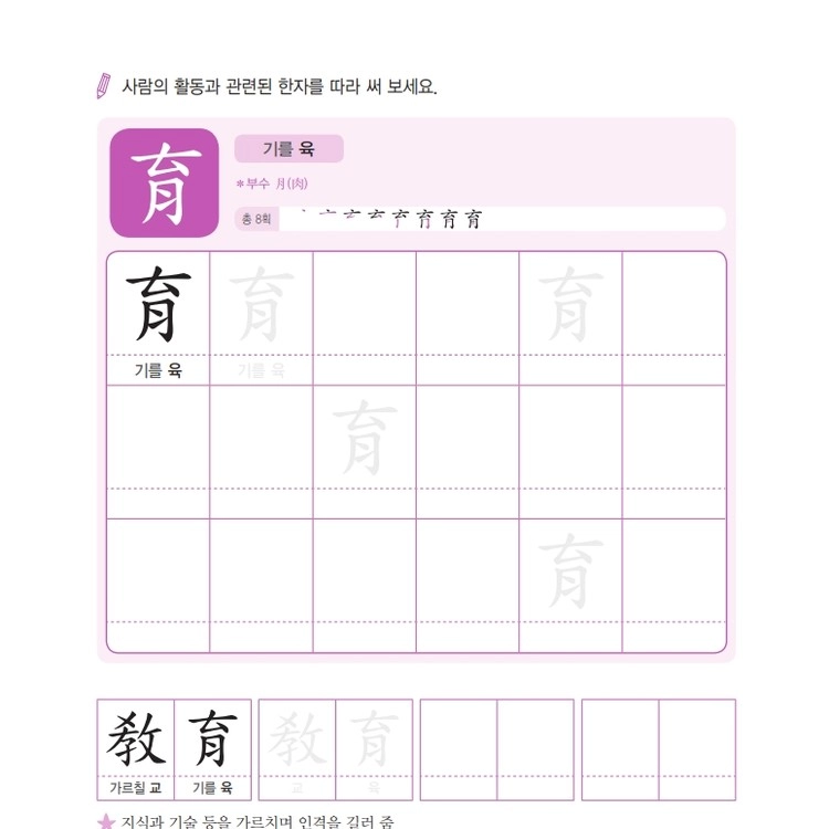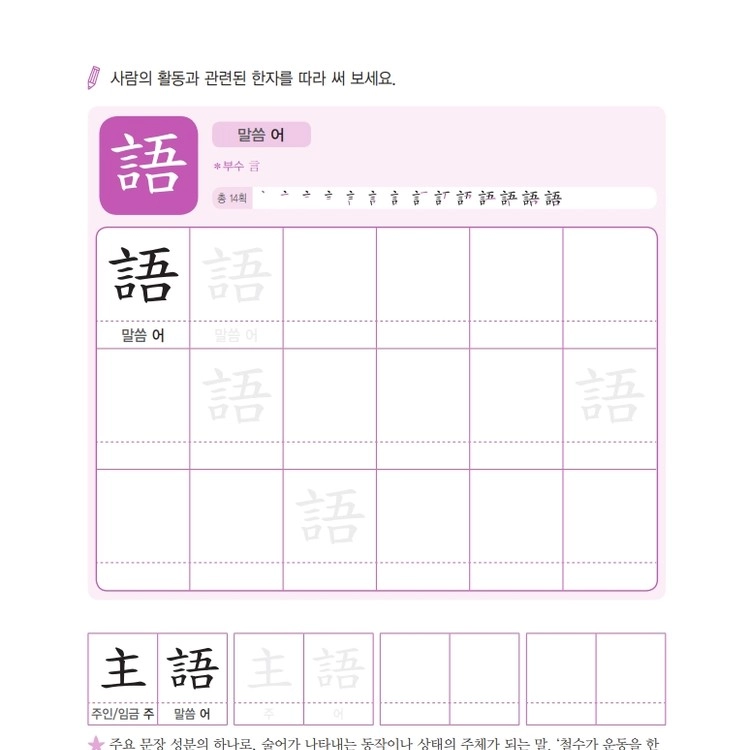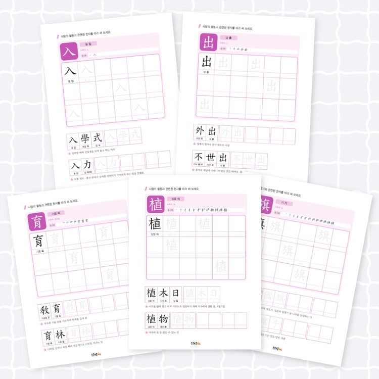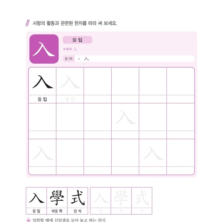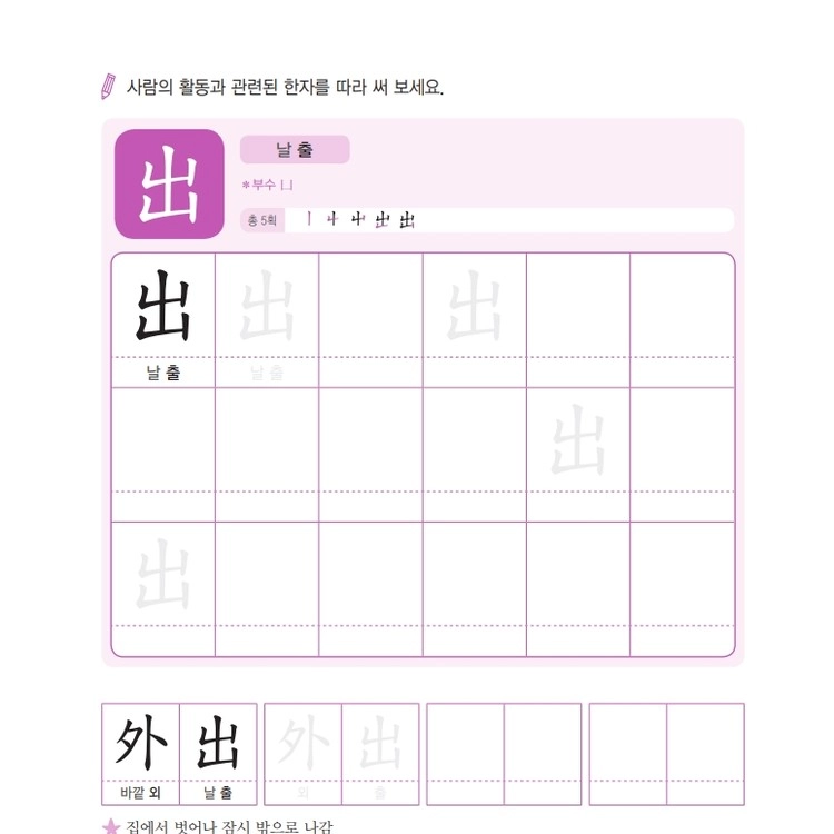 따라쓰기는 단순 반복 대신 한자가 포함된 어휘를 함께 쓰며 학습 효과를 높여요.