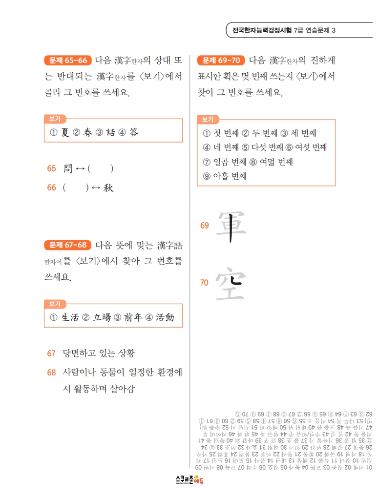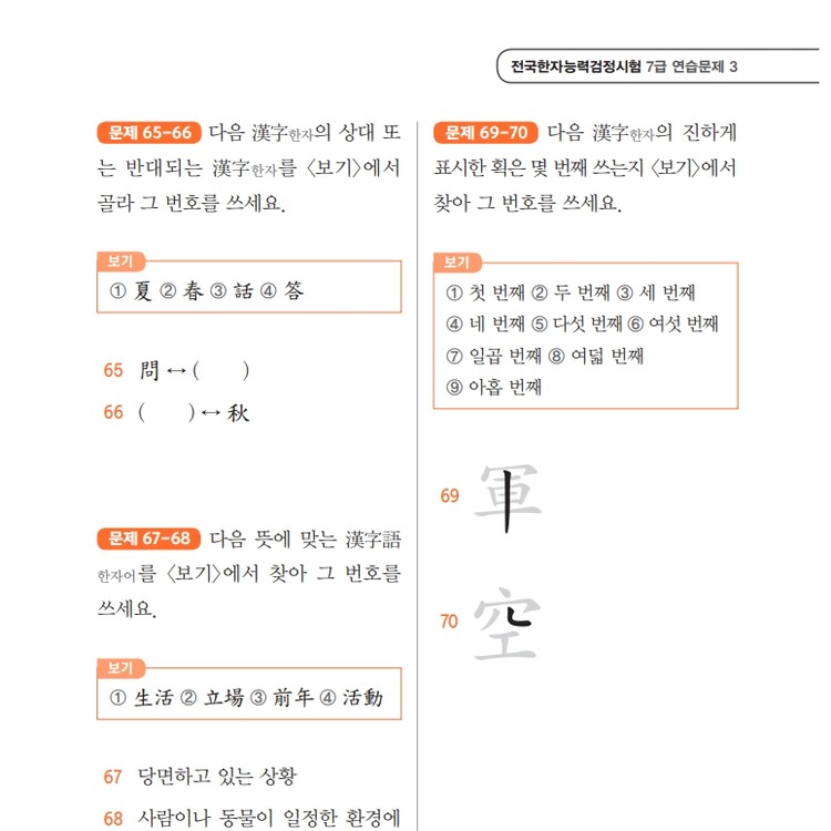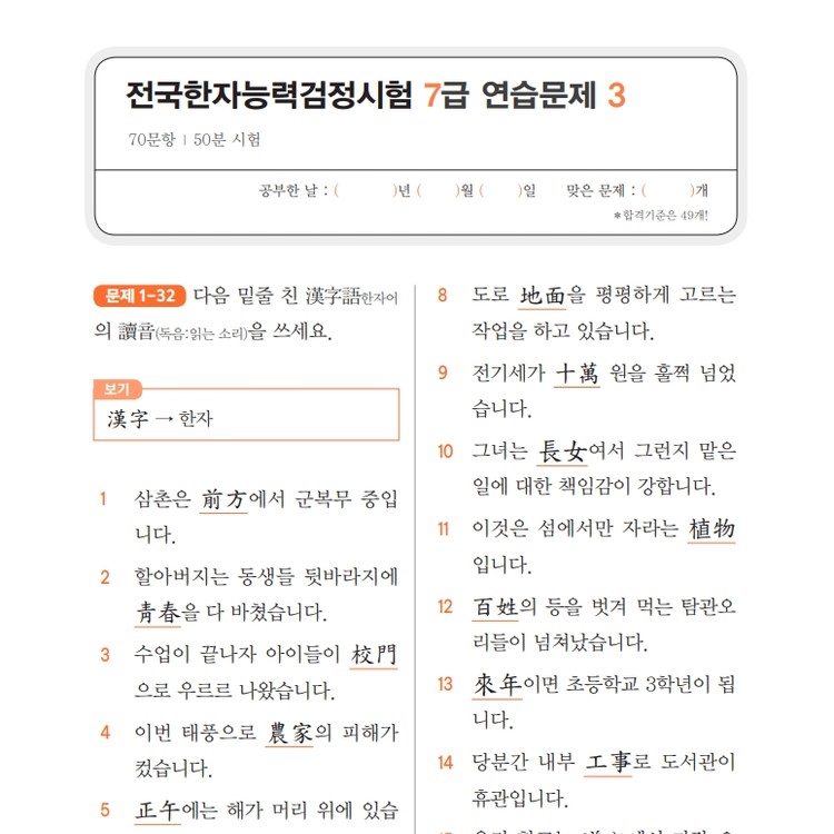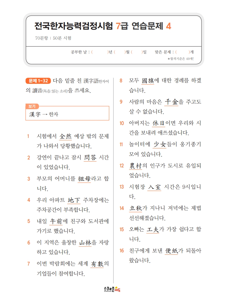 문제집은 표지의 7급 한자를 먼저 읽으며 기초를 점검하고, 문제풀이에 들어가요.