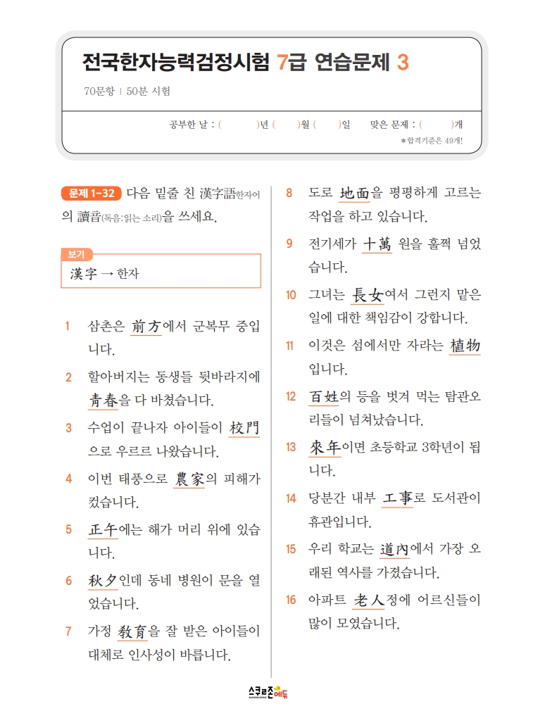 <스스로 급수한자>로 반복 연습하여 자격증은 물론, 어휘력 만렙 되자!