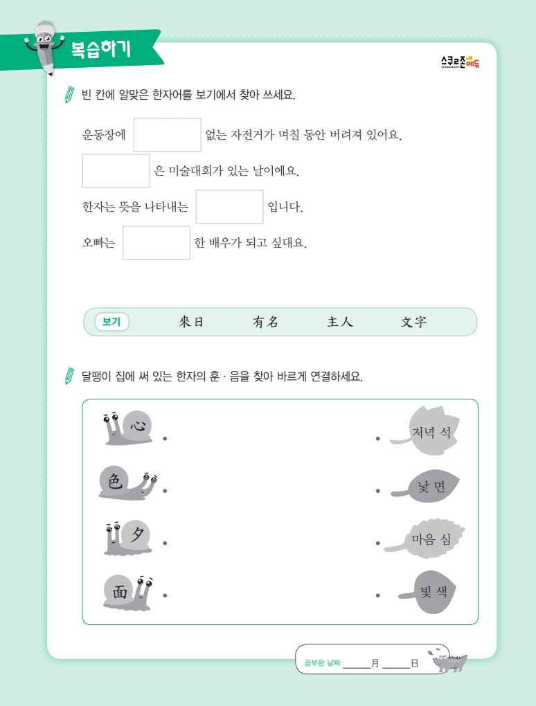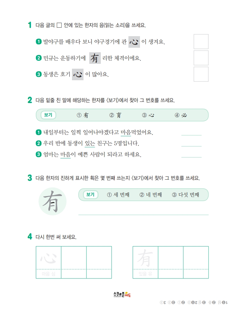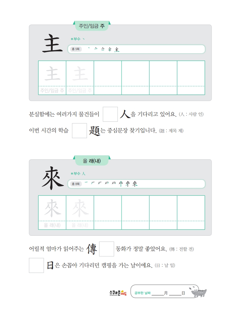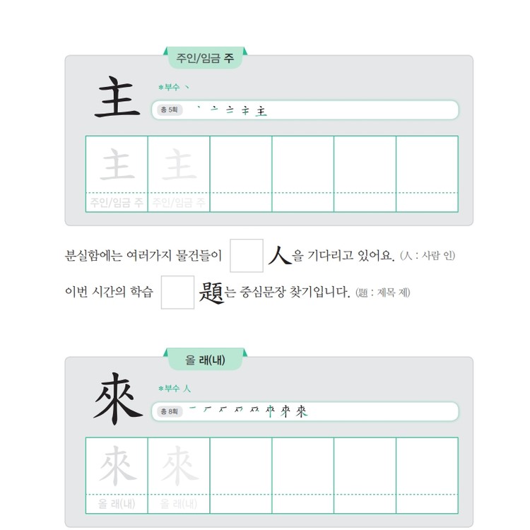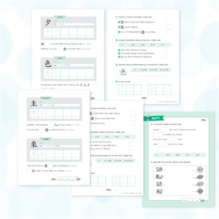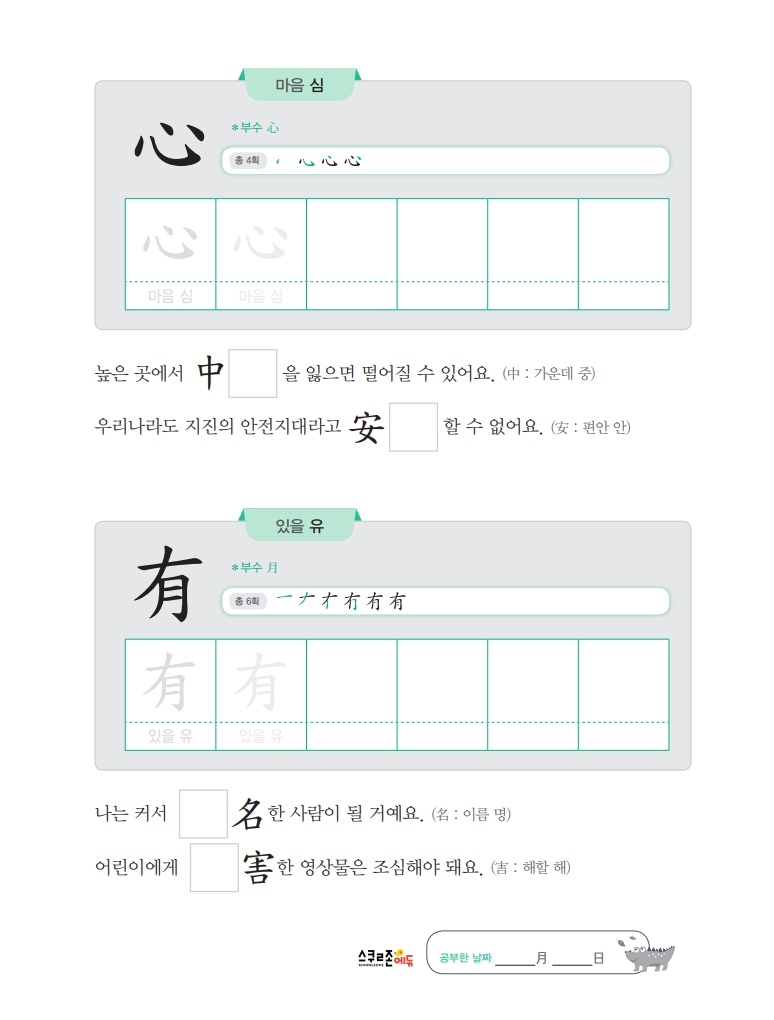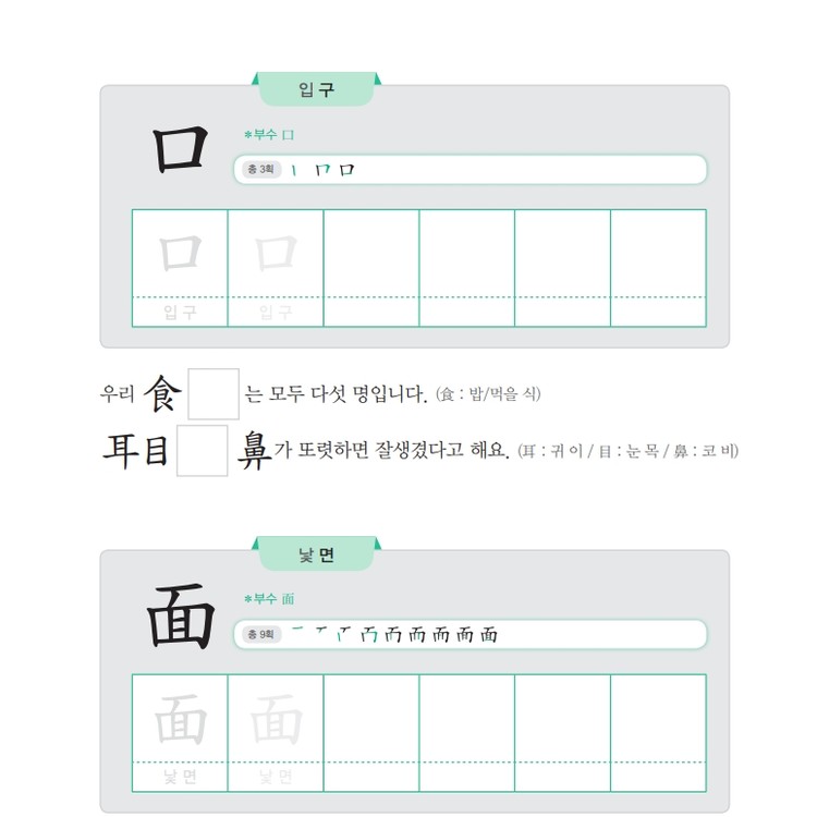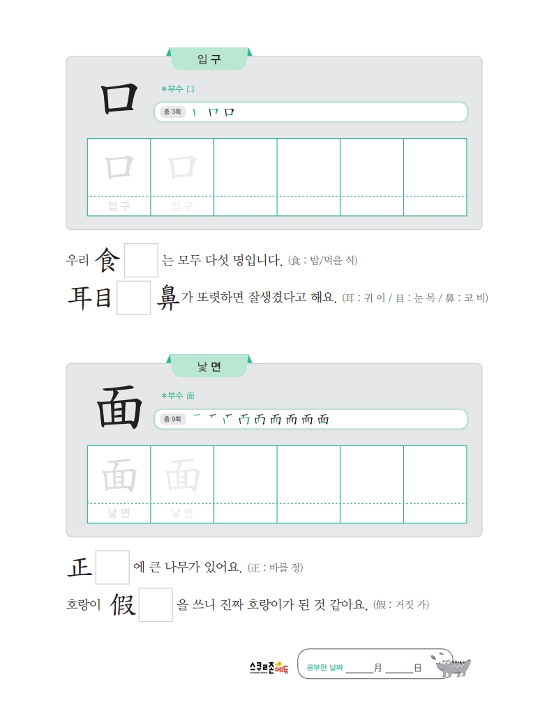익힘책은 하루 5분, 하루 2자씩 5주간 학습하도록 구성, 한자의 기본인 부수를 익히고,