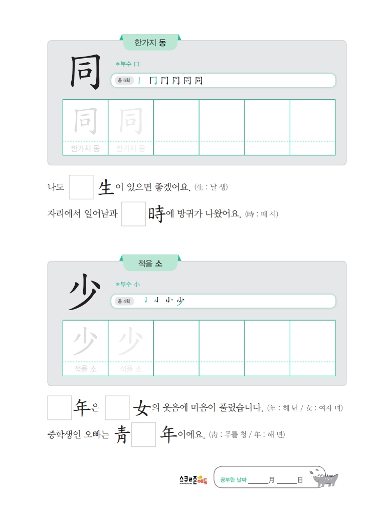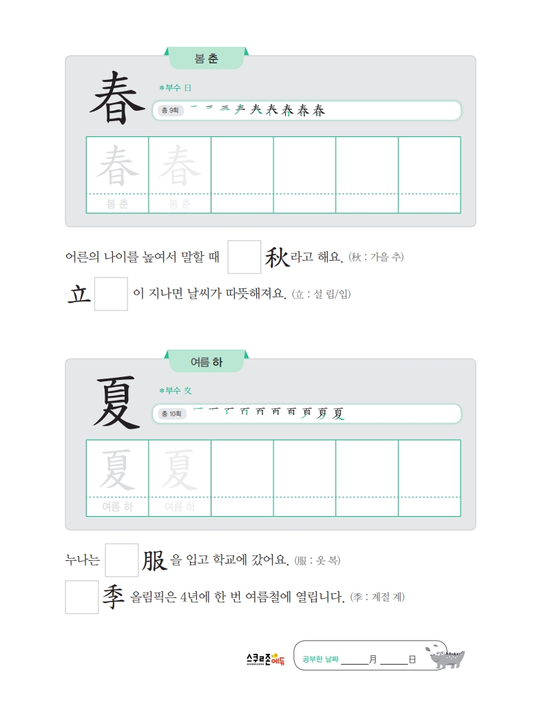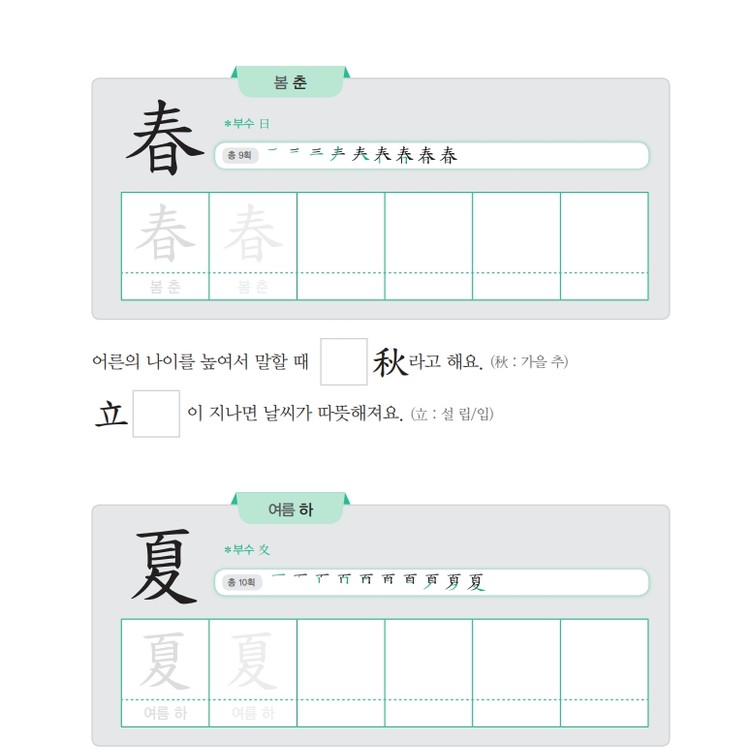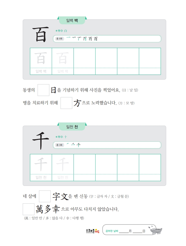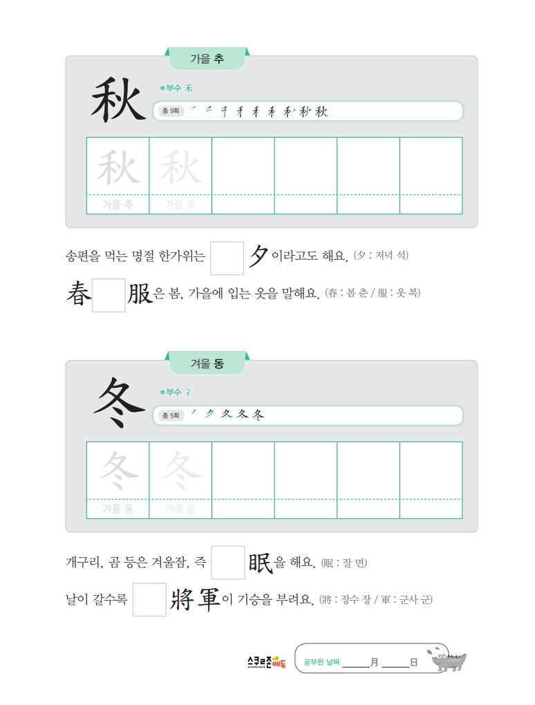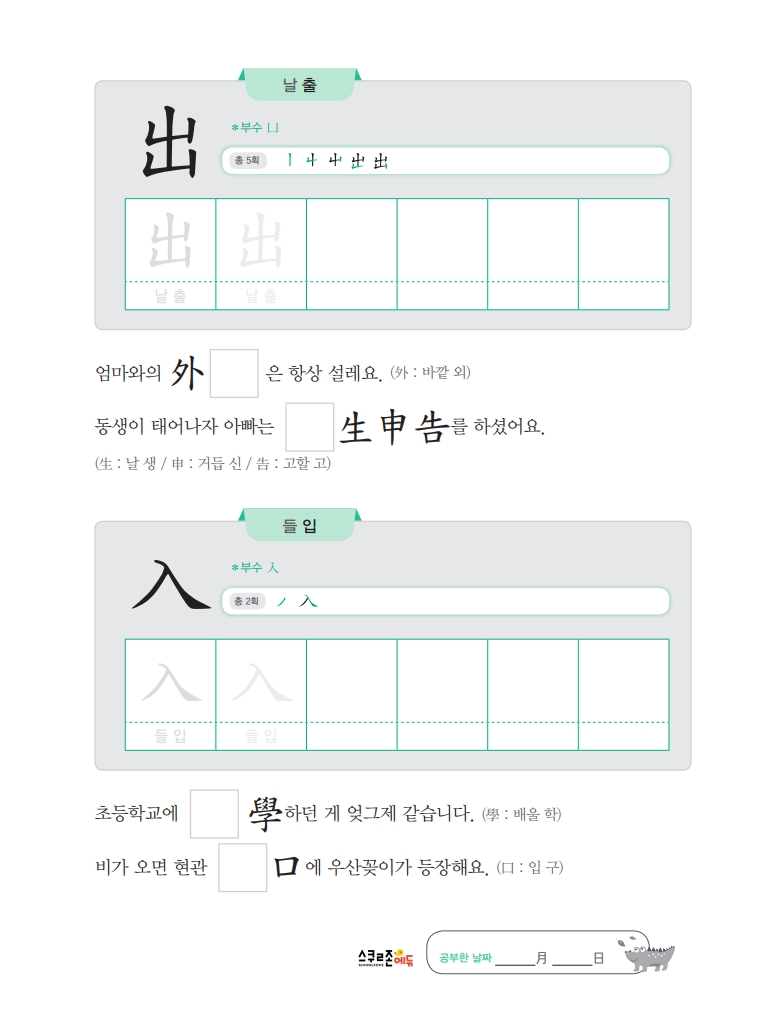 익힘책은 하루 5분, 하루 2자씩 5주간 학습하도록 구성, 한자의 기본인 부수를 익히고,