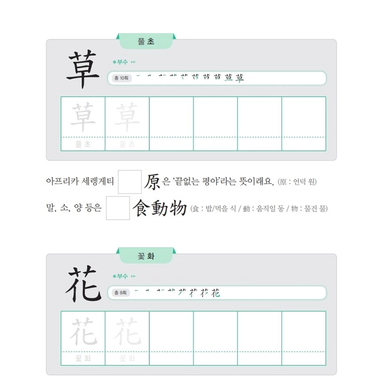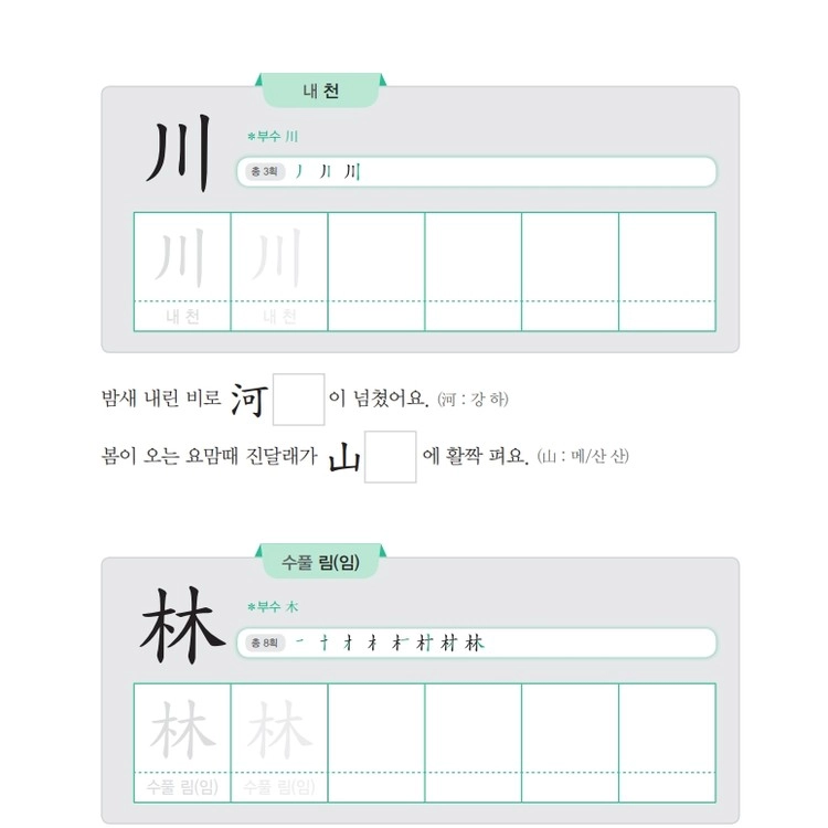 익힘책은 하루 5분, 하루 2자씩 5주간 학습하도록 구성, 한자의 기본인 부수를 익히고,