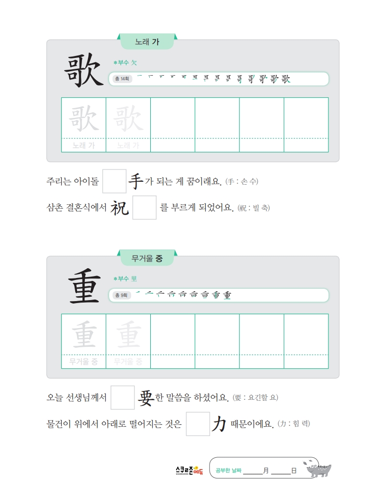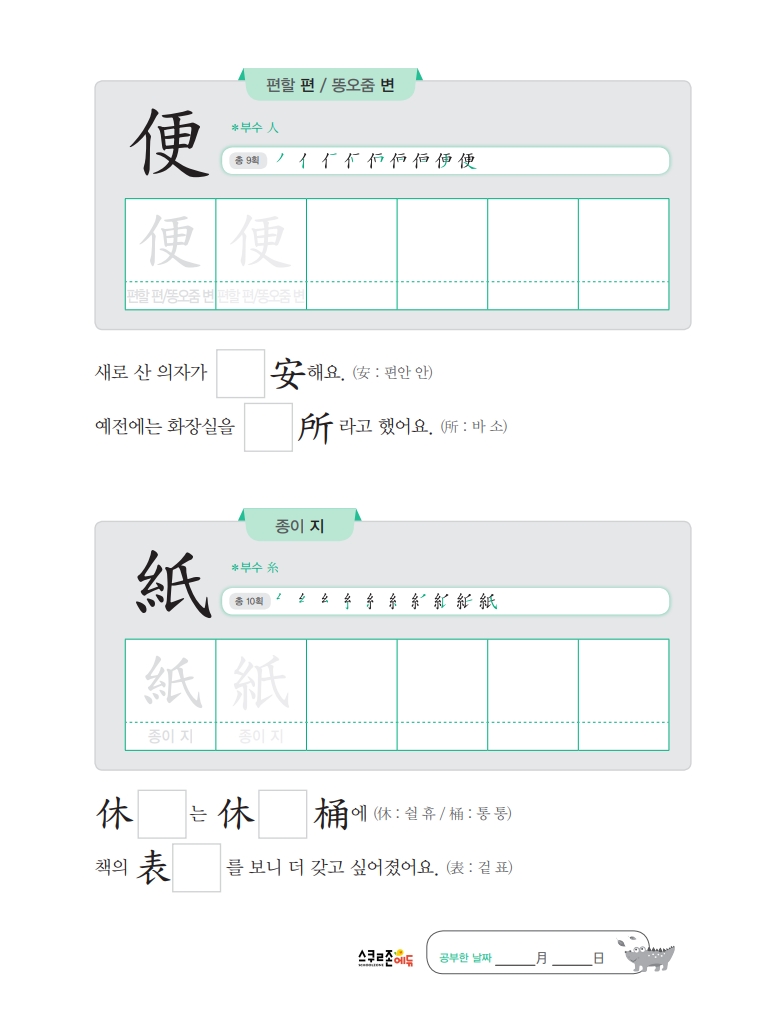 익힘책은 하루 5분, 하루 2자씩 5주간 학습하도록 구성, 한자의 기본인 부수를 익히고,