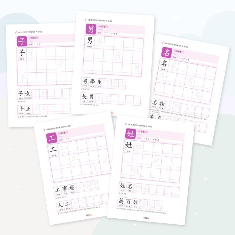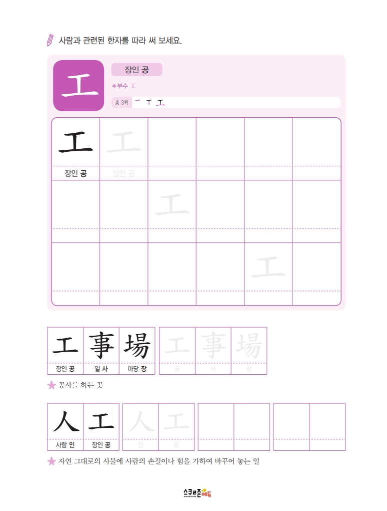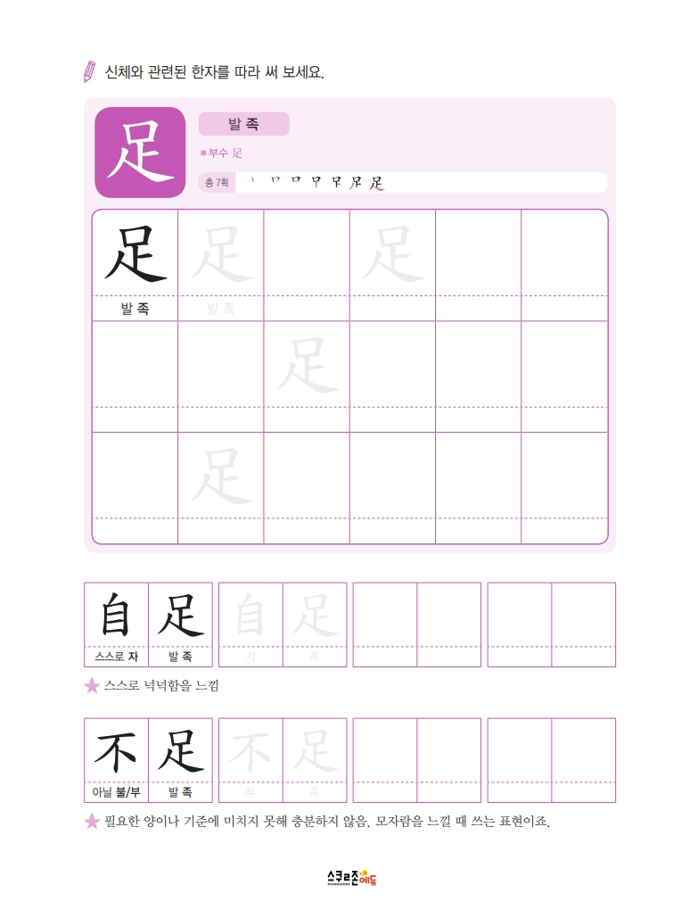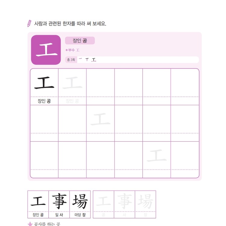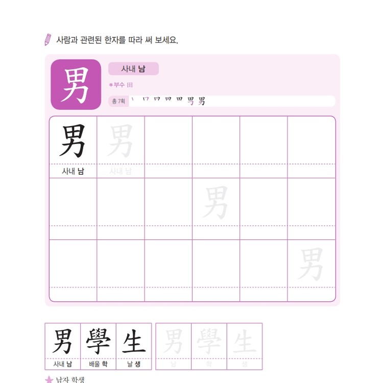 따라쓰기는 단순 반복 대신 한자가 포함된 어휘를 함께 쓰며 학습 효과를 높여요.