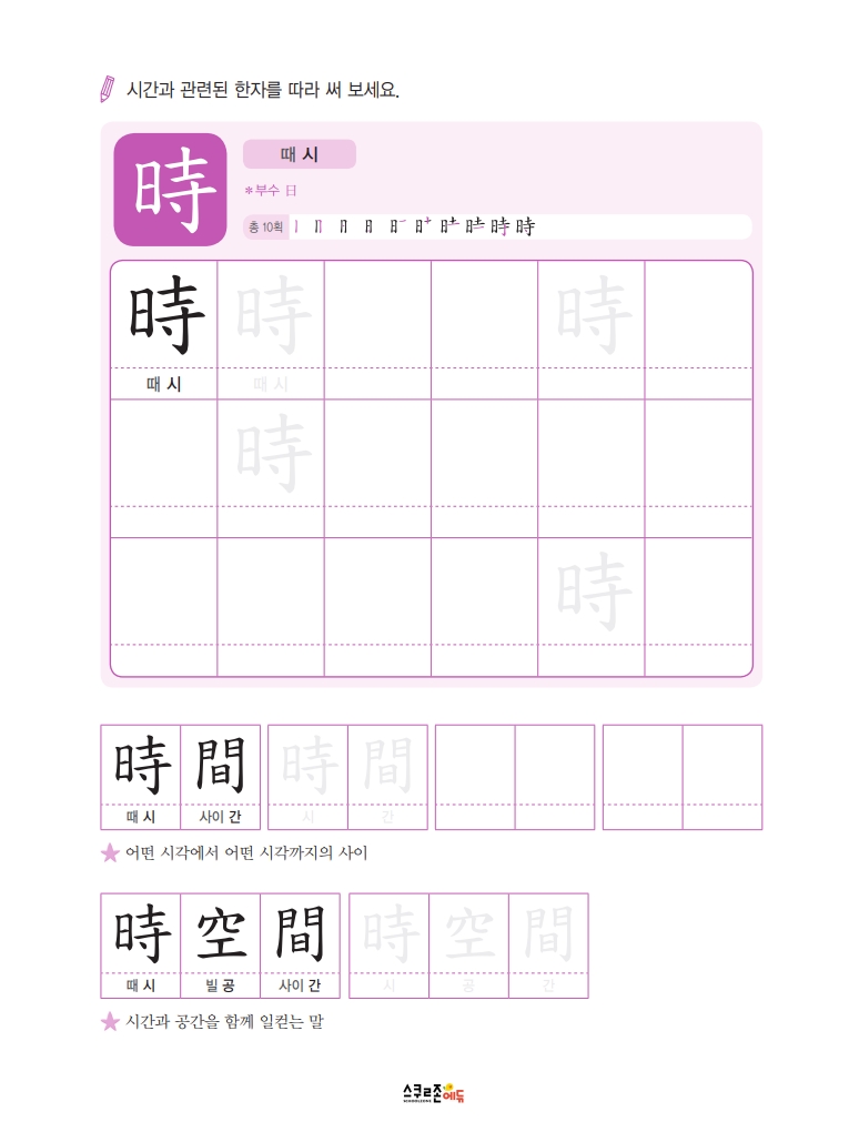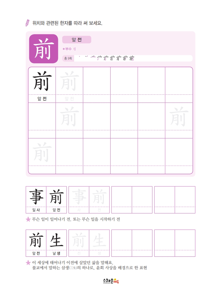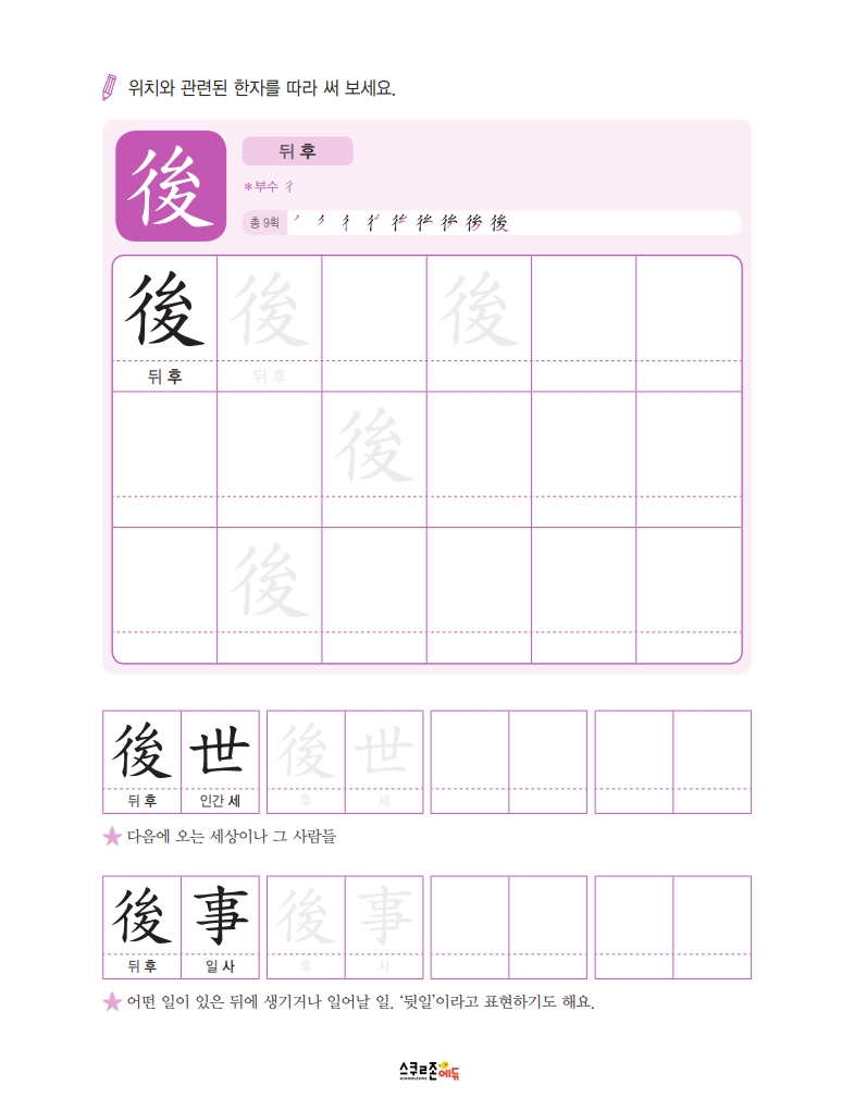 따라쓰기는 단순 반복 대신 한자가 포함된 어휘를 함께 쓰며 학습 효과를 높여요.
