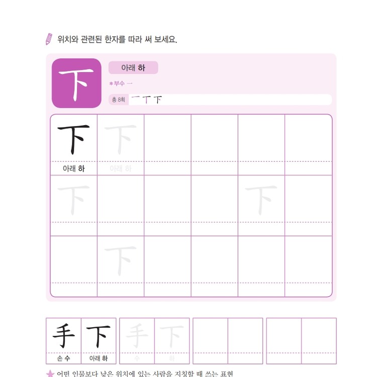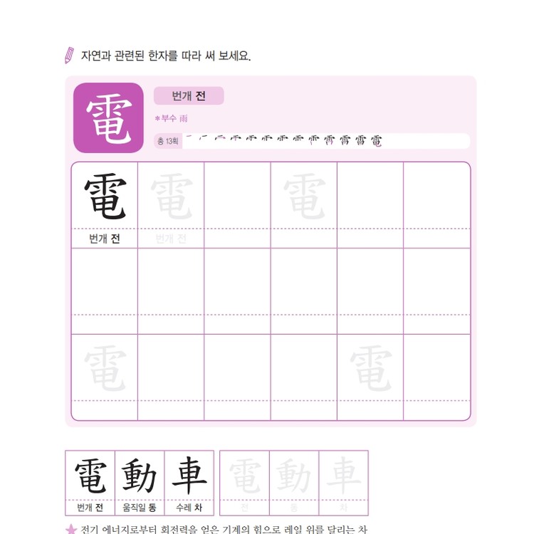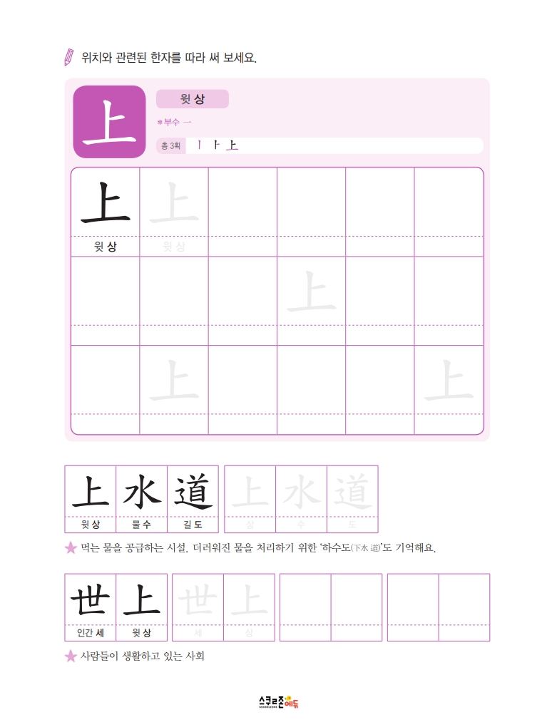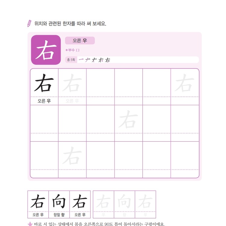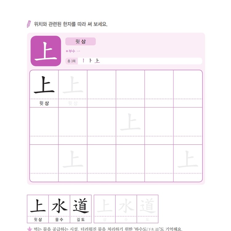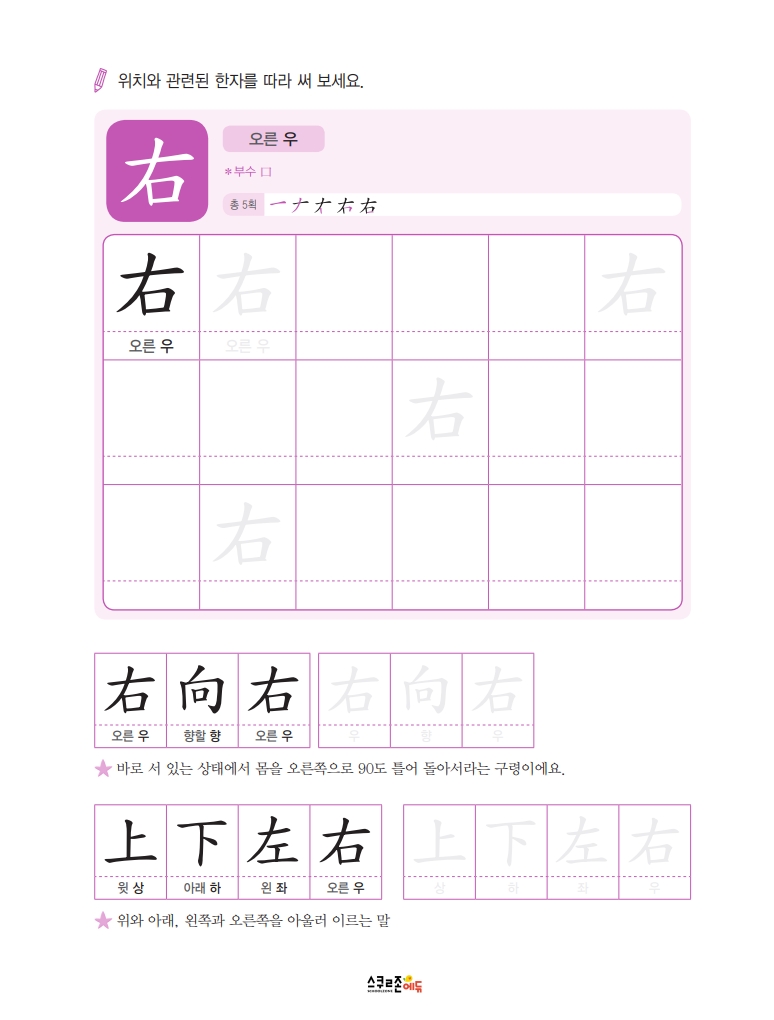 따라쓰기는 단순 반복 대신 한자가 포함된 어휘를 함께 쓰며 학습 효과를 높여요.