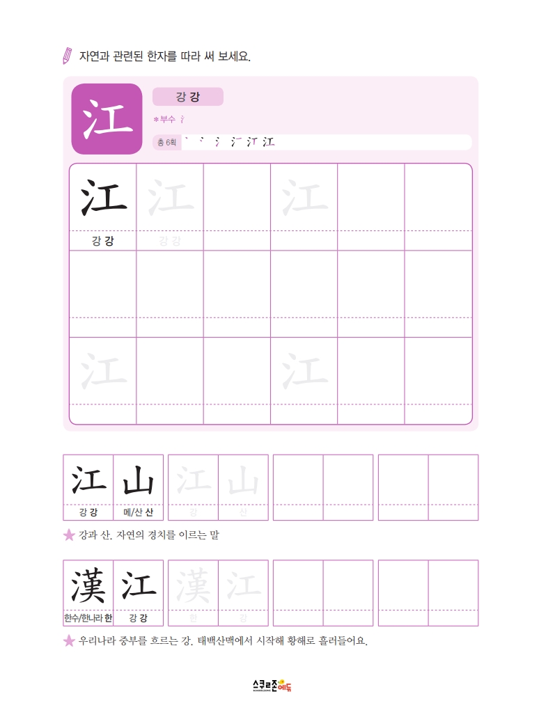한자의 모양 · 소리 · 뜻을 연결하며 어휘력과 문해력이 동시에 강화돼요.