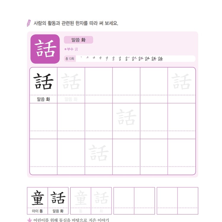따라쓰기는 단순 반복 대신 한자가 포함된 어휘를 함께 쓰며 학습 효과를 높여요.