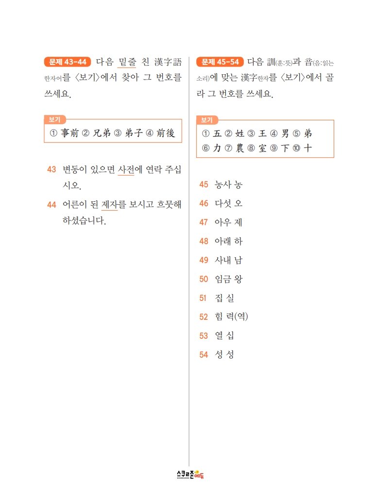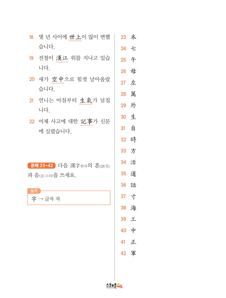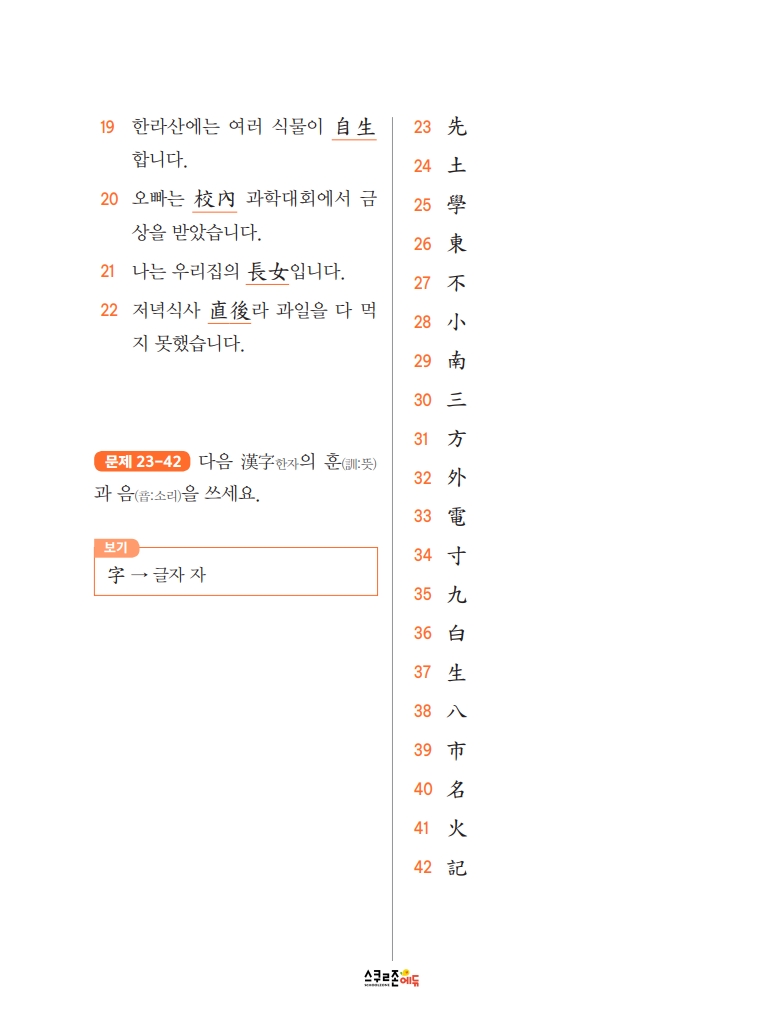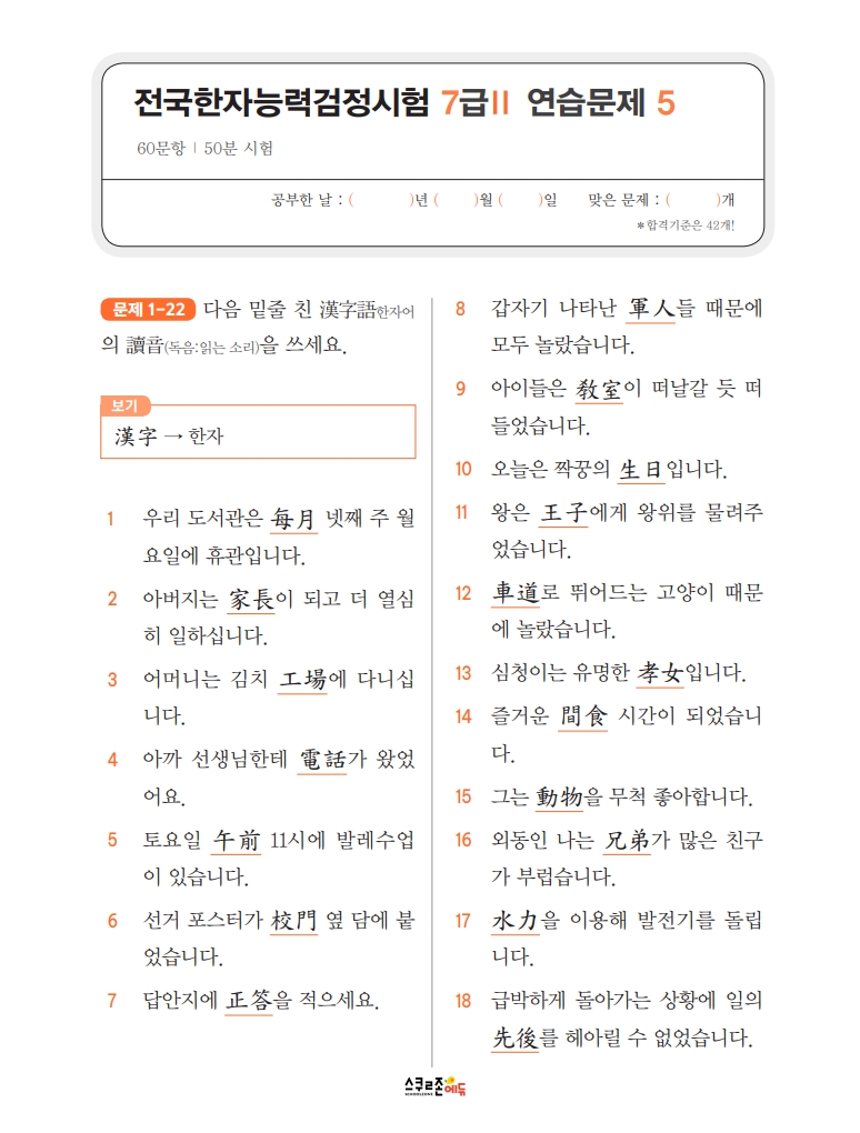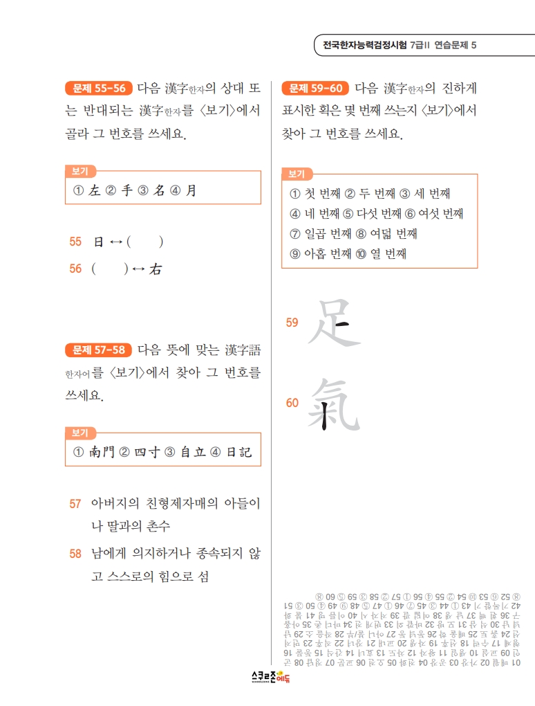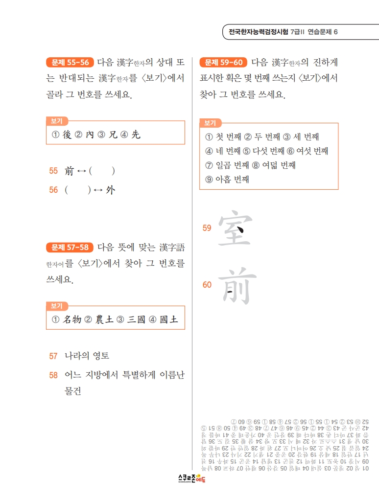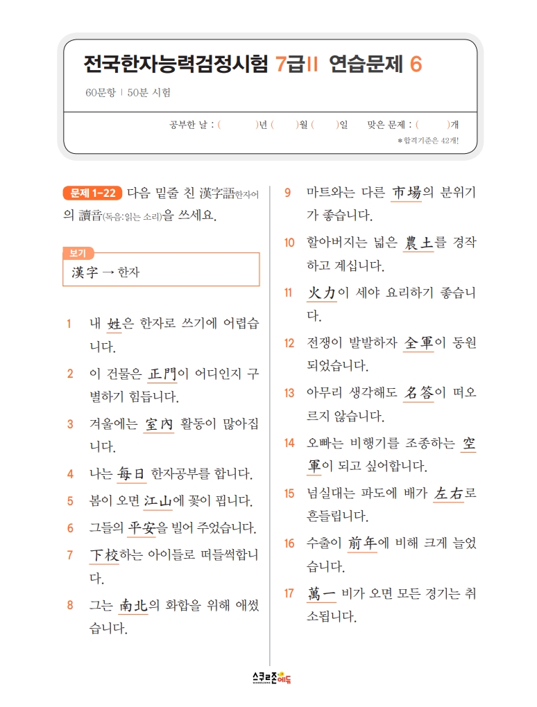 스스로 급수한자 7급Ⅱ 문제집 시트지 4