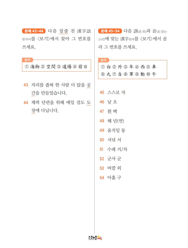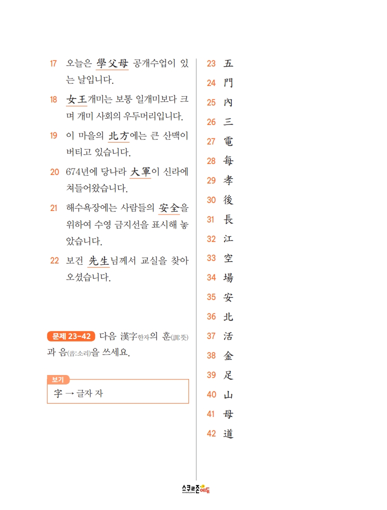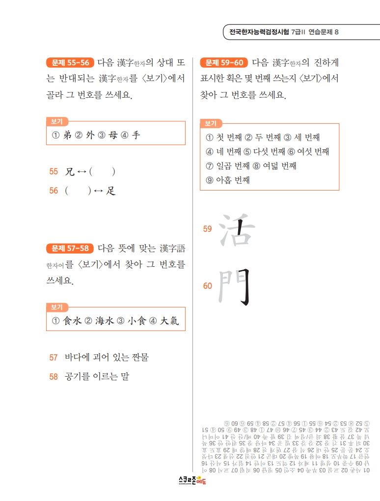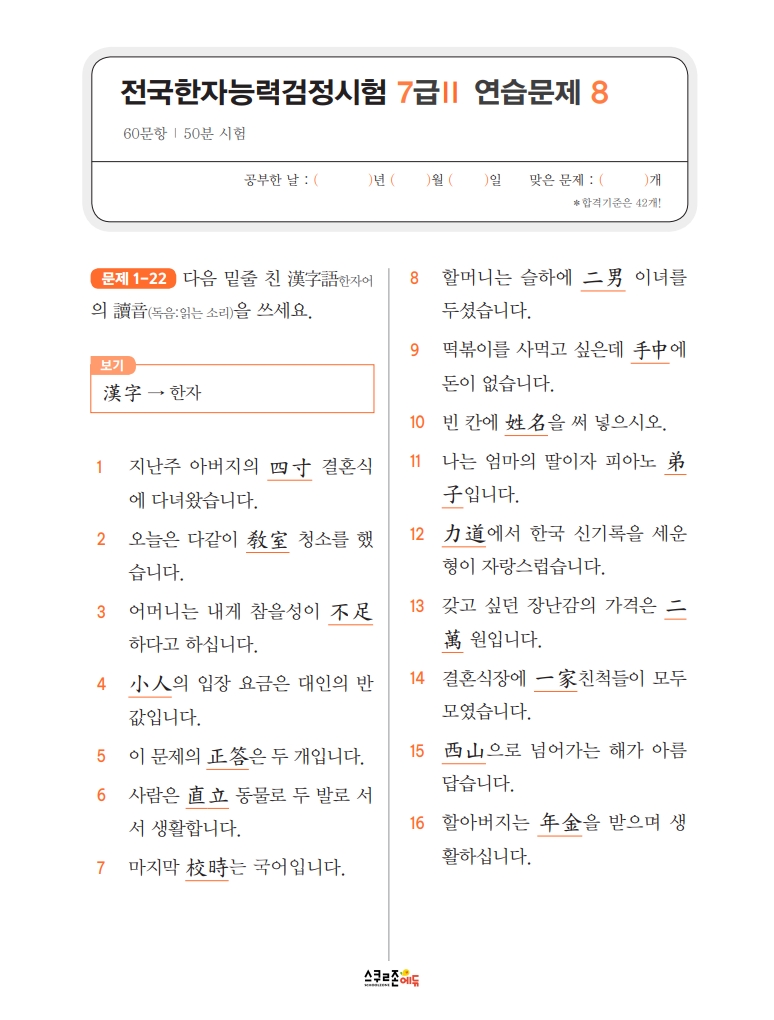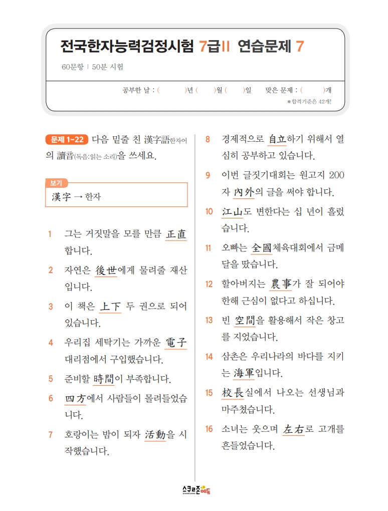 스스로 급수한자 7급Ⅱ 문제집 시트지 5