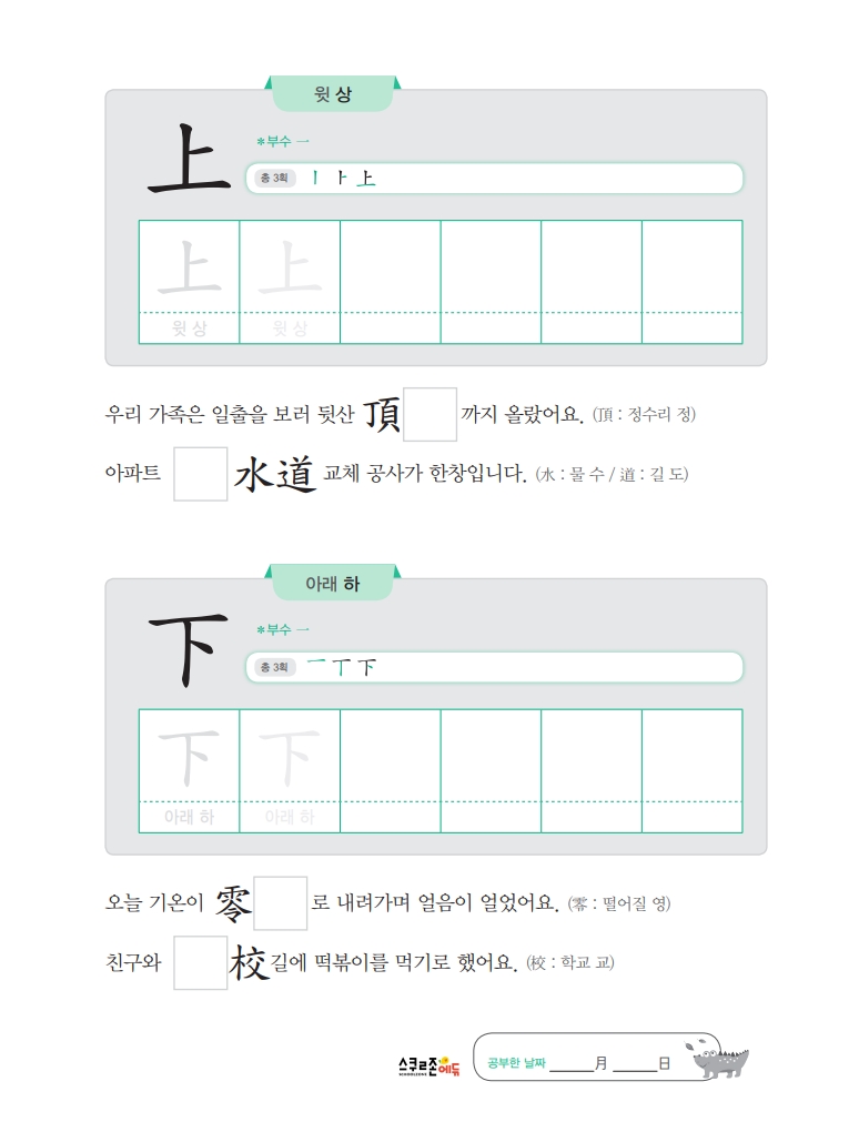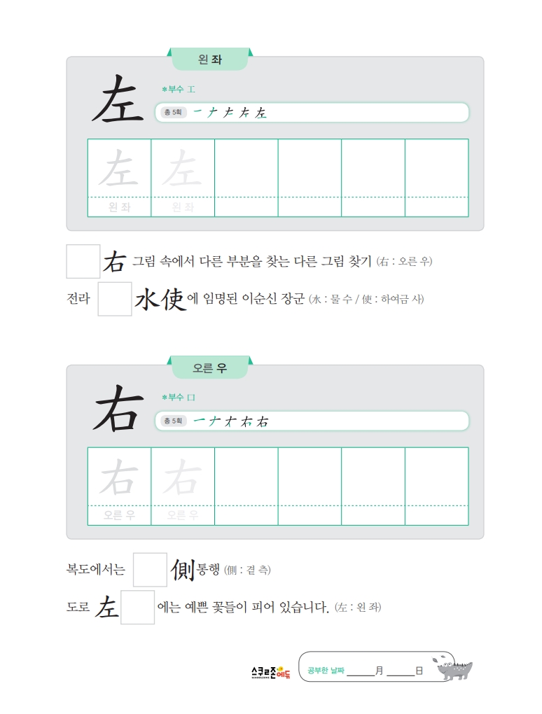 익힘책은 하루 5분, 하루 2자씩 5주간 학습하도록 구성, 한자의 기본인 부수를 익히고,