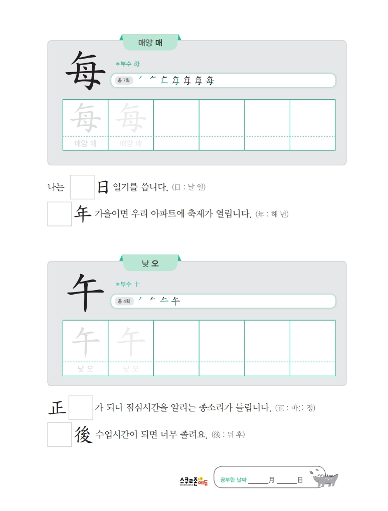 익힘책은 하루 5분, 하루 2자씩 5주간 학습하도록 구성, 한자의 기본인 부수를 익히고,